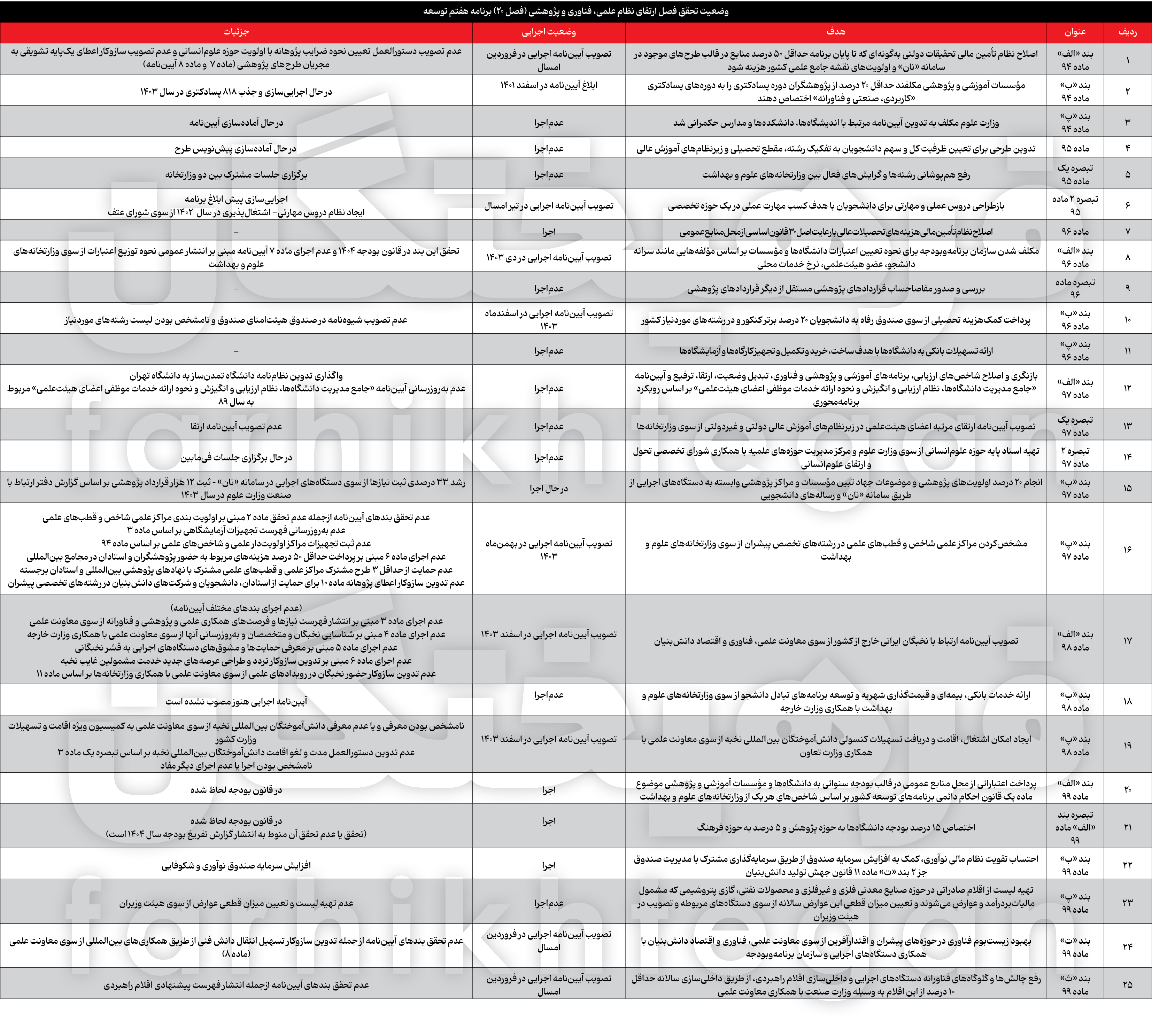 فصل 20 برنامه توسعه ارتقای نظام علمی، فناوری و پژوهشی را در قالب 7 ماده 7 تبصره طراحی کرده تا اینگونه در عرصه آموزشی، پژوهشی، سازوکار تأمین مالی وظایفی را متوجه وزارتخانههای علوم، بهداشت، معاونت علمی، فناوری و اقتصاد دانشبنیان کند. برنامه هفتم در ابتدای این فصل، جدولی از سنجههای عملکردی را قرار داده تا اینگونه مؤلفههای تحقق برنامه در پایان سال 1407 مشخص شود. البته وقتی وضعیت امروز کشور در سنجههای مختلف را مورد بررسی قرار دادیم، نتوانستیم به تصویر روشنی دست پیدا کنیم. واقعیت این است که جز برخی از شاخصها مانند رتبه 17 دنیا در تولید علم یا جایگاه 61 ایران در شاخص نوآوری و 54 در تعداد اختراعات ثبتشده خارجی، برای دیگر مؤلفهها نمیتوان به آمار دقیقی دست پیدا کرد. حوزههایی که یا نهادهای متولی آن اطلاعات بهروز را منتشر نمیکنند و یا تعدد مجموعههای درگیر و اظهارنظرهای متفاوت مسئولان، باعث شده تا امکان دستیابی به آمار متقن فراهم نباشد. در این شرایط میطلبد تا نمایندگان مجلس که وظیفه نظارتی بر روند اجرای اسناد بالادستی را برعهده دارند، وارد میدان شده و بعد از گذشت یک سال از ابلاغ برنامه هفتم، گزارشی مبسوط از روند اجرایی آن در بخشهای مختلف از جمله فصل بیستم ارائه دهند؛ چراکه نمیتوان انتظار داشت بدون پایش سال به سال میزان اجراییسازی برنامه، در پایان سال پنجم به اهداف کمی درنظرگرفتهشده در این برنامه دست پیدا کنیم. با این وجود «فرهیختگان» در این گزارش تلاش کرده تا وضعیت تدوین شیوهنامهها و آییننامههای مربوط به مواد مختلف این برنامه را بعد از گذشت یک سال از ابلاغ در حوزه آموزش عالی پیگیری و بررسی کند.