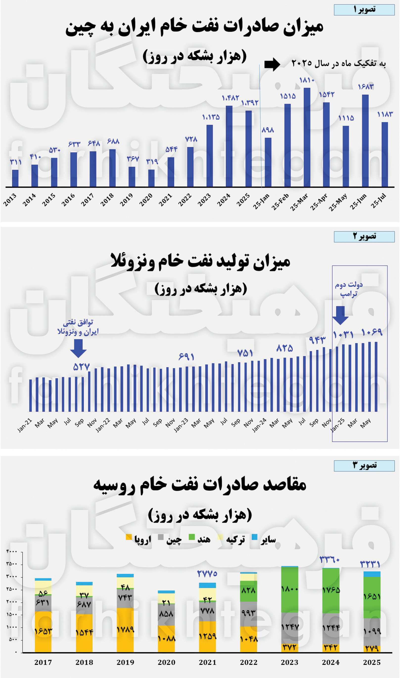 اما تولید نفت ونزوئلا در سال ۲۰۲۵ نه تنها کاهش نیافته بلکه با ۳۸ هزار بشکه افزایش، به یک میلیون و ۶۹ هزار بشکه در روز رسیده است. همین موضوع باعث شد که ترامپ مجدداً مجوز فعالیت شرکت شورون در ونزوئلا را صادر کند و طرح تعرفه ۲۵ درصدی را نیز تاکنون در حالت اغما نگه داشته است.