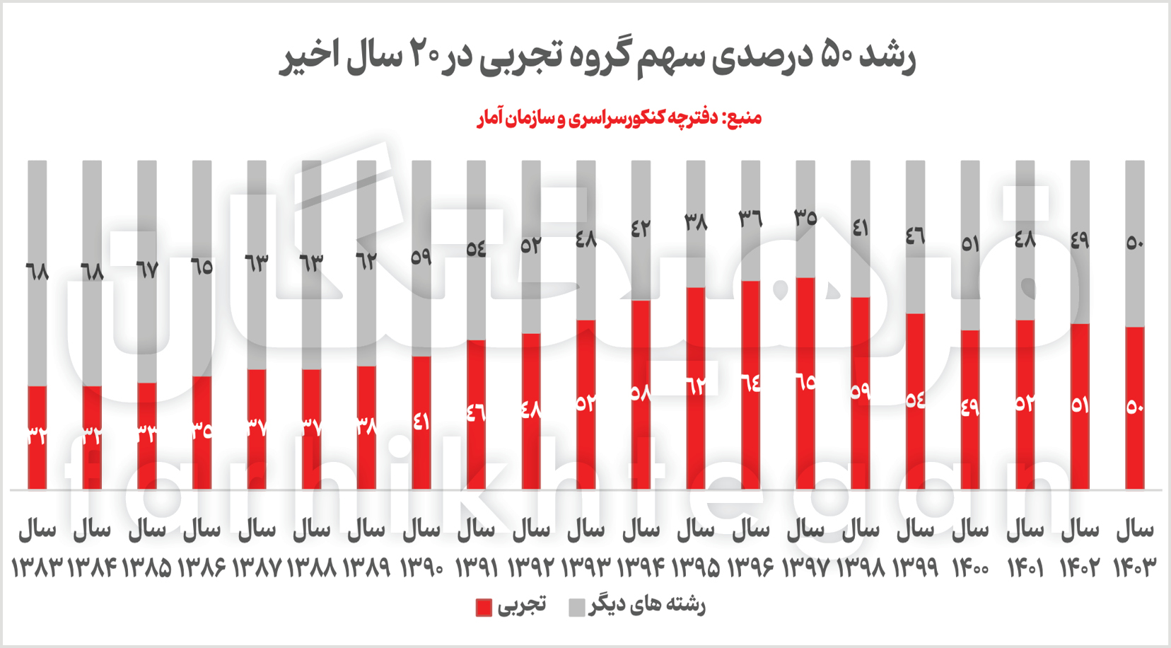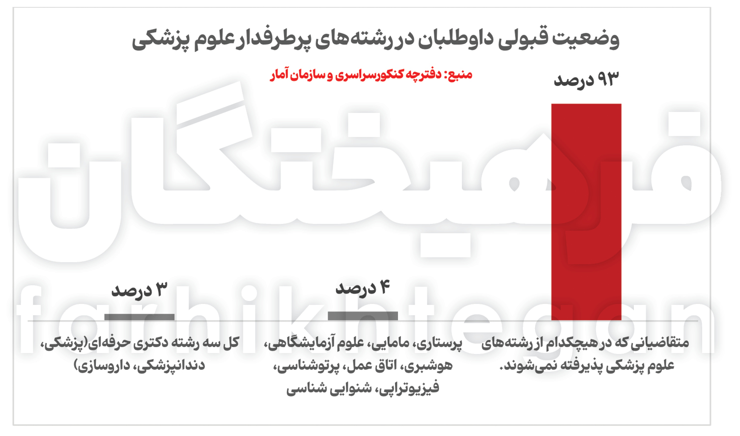 در آن سوی کنکور تجربی و این رقابت بهشدت سخت تنها 7 درصد شانس قبولی در رشتههای علوم پزشکی را پیدا میکنند که همین 7 درصد نیز سه درصد مربوط به سه رشته پرطرفدار پزشکی و دندانپزشکی و داروسازی است و 4 درصد دیگر نیز مربوط به بقیه رشتههای علوم پزشکی از قبیل پرستاری، مامایی، هوشبری، تکنسین اتاق عمل، علوم آزمایشگاهی، فیزیوتراپی، بینایی سنجی، رادیولوژی است و البته که این ظرفیت پذیرش شامل پذیرش در همه رشته محلهای دانشگاههای آزاد و دولتی است و در واقع بقیه 93 درصد هیچ فرصتی برای حضور در رشتههای علوم پزشکی نه در بخش دولتی و نه در دانشگاه آزاد اسلامی پیدا نمیکنند و باید پرسید که چه آیندهای در انتظار آنهاست و در مواجهه با نبود فرصت حضور در رشته مورد علاقهشان چه مسیری را در آینده در پیش خواهند گرفت؟ البته آنقدر این رقابت سخت و شانس قبولی پایین است که ماندن پشت کنکور هم آنچنان تضمینی بر قبولی آنها نخواهد داشت و قبولی در رشتههای علوم پزشکی برایشان بیشتر شبیه به یک معجزه است.
