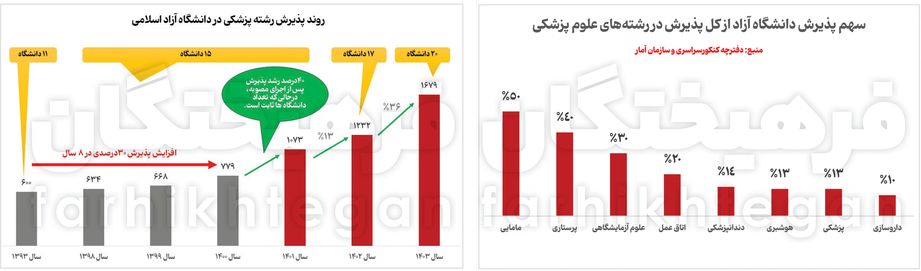 وضعیت پذیرش رشته پزشکی در سالهای اخیر در دانشگاه آزاد اسلامی است که نشاندهنده رشد قابل توجه تخصیص ظرفیت پزشکی به این دانشگاه در مقطع زمانی اجرای مصوبه افزایش ظرفیت پزشکی است و این دانشگاه با تخصیص ظرفیت بیشتر از سوی وزارت بهداشت، درمان و آموزش پزشکی توانایی افزایش قابل توجه ظرفیت پذیرش در واحدهای فعلی و راهاندازی واحدهای جدید پزشکی در دیگر واحدهای دارای زیرساخت و ظرفیت است؛ البته که لازمه این توسعه آموزش پزشکی در واحدهای دانشگاه آزاد اسلامی تشریک مساعی و همکاری بیشتر دانشگاه آزاد اسلامی با دانشگاههای علوم پزشکی است که به واسطه این اتفاق فشار اجرایی و تصدیگری وزارت بهداشت و دانشگاههای علوم پزشکی کاهش مییابد و وزارت بهداشت میتواند تمرکز بالاتری در نظارت و اعتبار سنجی آموزش پزشکی داشته باشد.