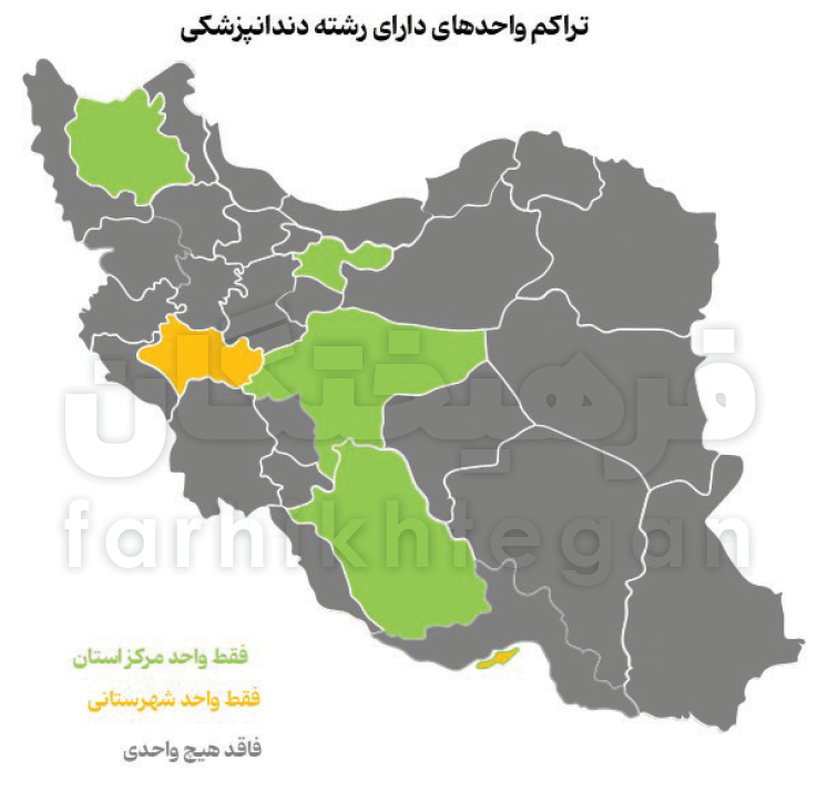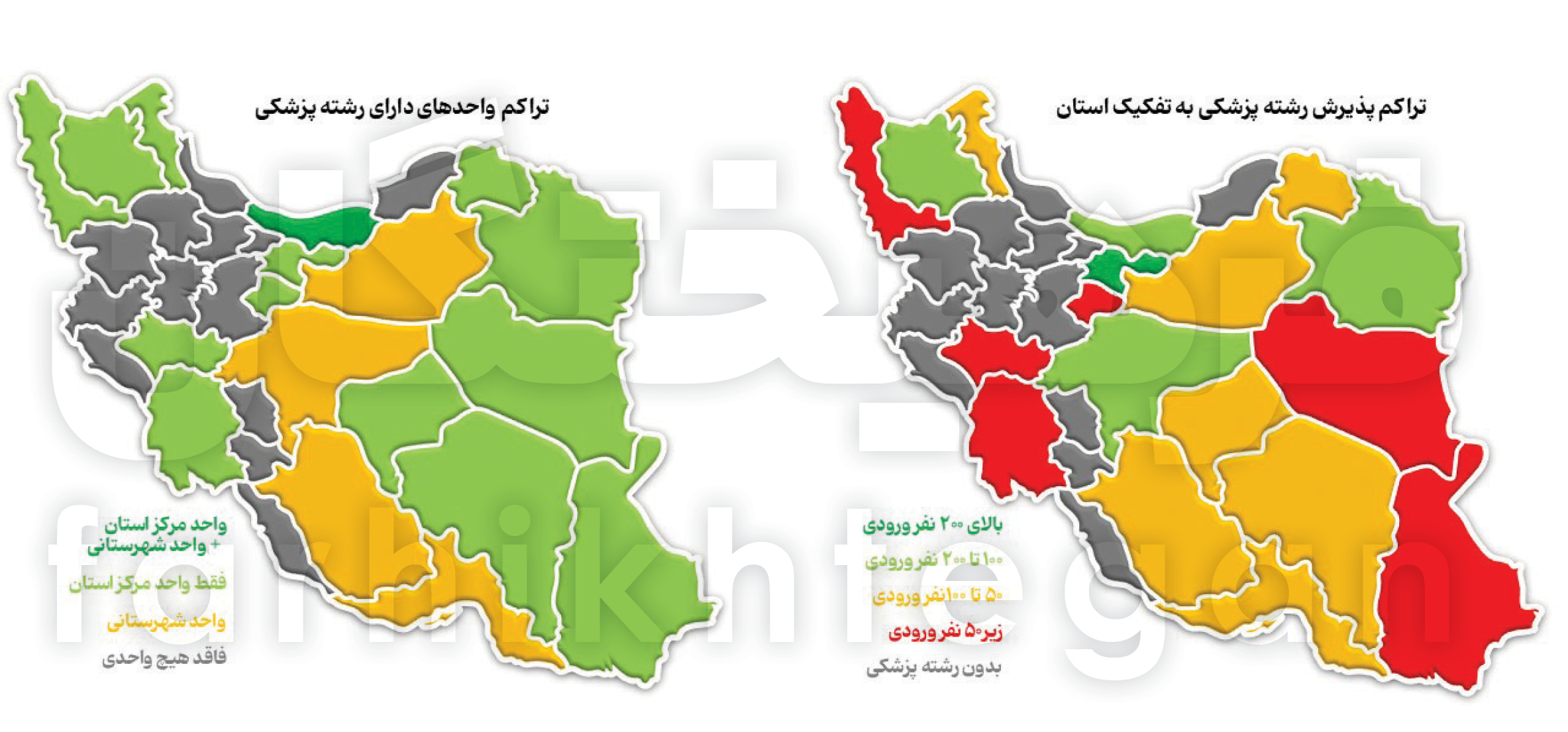 نقشه سمت چپ نشاندهنده تراکم استانهای دارای واحد با رشته پزشکی در کشور است؛ استانهای با رنگ خاکستری واحدهای بدون رشته پزشکی هستند که شامل 13 استان البرز، مرکزی، قزوین، زنجان، همدان، گیلان، گلستان، ایلام، بوشهر، کهگیلویه و بویراحمد، چهارمحال و بختیاری، کردستان، کرمانشاه میشود.
