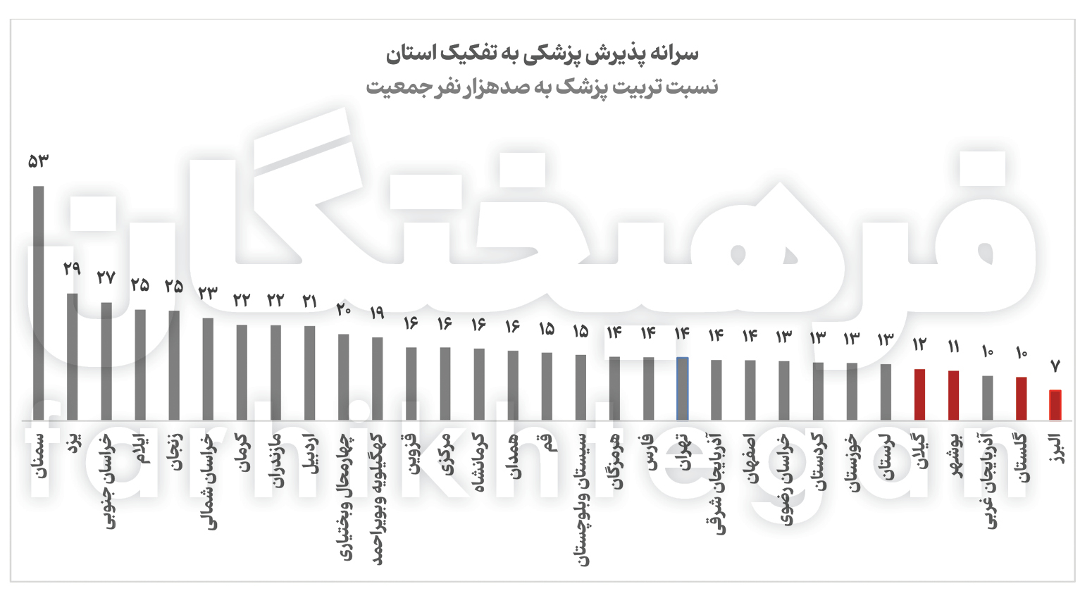 استانهایی که با رنگ زرد نشان داده شدهاند شامل استانهای کرمان، یزد، فارس، هرمزگان، سمنان، گلستان و اردبیل بین 50 تا 100 نفر ورودی داشتهاند که باتوجه به ظرفیت و زیرساختهای آموزشی و بیمارستانی این استانها، ظرفیت اندکی است و میتواند توسعه پیدا کند؛ استانهایی که با رنگ سبز نشان داده شده است ظرفیت بین 100 تا 200 نفر رادارند مانند اصفهان، آذربایجان شرقی، خراسان رضوی و مازندران که البته باتوجه به ظرفیتهای بالایی که در استانهای بزرگی مانند اصفهان، آذربایجان شرقی و خراسان رضوی وجود دارد میتوانند ظرفیت پذیرش بیشتری را داشته باشند.
