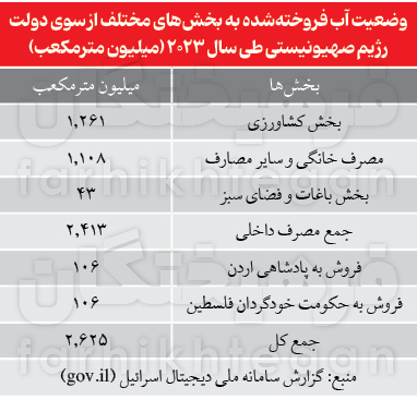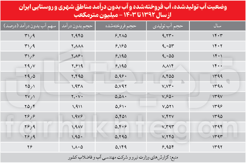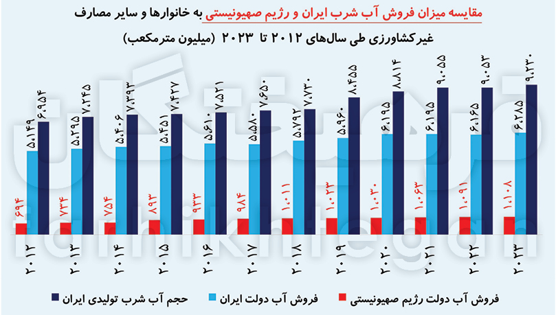 براساس گزارشهای وزارت نیرو و شرکت مهندسی آب و فاضلاب کشور، میزان حجم آب تولیدی کشور از حدود 7 میلیارد مترمکعب در سال 1392 به 9.2 میلیارد مترمکعب در سال 1403 رسیده است. همچنین طی این مدت، حجم آب فروخته شده به مناطق شهری و روستایی کشور از 5.1 میلیارد مترمکعب در سال 1392 به 6.3 میلیارد مترمکعب در سال 1403 رسیده است. اگر معیار اول را مدنظر قرار بدهیم، یعنی هر دو آمار آب در مناطق شهری و روستایی در ایران و اسرائیل را آب تأمین شده بنامیم، ایران حدود 9 برابر رژیم صهیونیستی آب برای مناطق شهری و روستایی خود تأمین میکند (9.2 میلیارد مترمکعب در مقابل 1.1 میلیارد مترمکعب). اما اگر آمار اسرائیل مربوط به فروش باشد و آب بدون درآمد از آن حذف شده باشد (که در گزارش حاضر این موضوع مبهم بود)، در آن صورت بازهم ایران 7 برابر اسرائیل آب به خانوارها فروخته است.