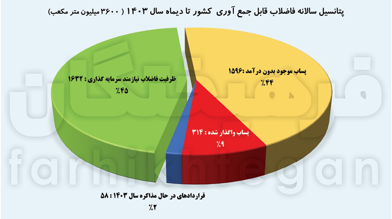 گزارش شرکت مهندسی آب و فاضلاب کشور نشان میدهد تا بهمن سال 1403 از مجموع ظرفیت 3.6 میلیارد مترمکعبی فاضلاب در کشور، تنها 9 درصد از آن در قالب پساب تصفیه شده به صنایع و معادن واگذار شده، 44 درصد از پساب موجود بدون درآمد عرضه شده و 45 درصد از فاضلاب نیز نیازمند سرمایهگذاری است.