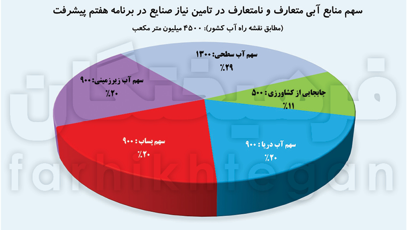 این درحالی است که در برنامه هفتم براساس جزء یک از بند «ب» ماده 39 وزارت نیرو مکلف است به منظور اصلاح الگوی مصرف بهینه آب و ارتقای بهرهوری، آب مورد نیاز صنایع آببر به جز صنایع غذایی، بهداشتی و آشامیدنی از آب نامتعارف (ازجمله پساب و آب دریا) تأمین کند. در برنامه هفتم وزارت نیرو مکلف شده حدود 1.8 میلیارد مترمکعب از آب موردنیاز صنایع را از طریق آبهای نامتعارف یعنی آب دریا و پساب تأمین کند. این مقدار شامل 900 میلیون مترمکعب آب دریا و 900 میلیون مترمکعب پساب خواهد بود که هرکدام سهم 20 درصدی و درمجموع سهم 40 درصد از تأمین آب صنایع کشور را که در سال 1407 حدود 4500 میلیون مترمکعب برآورد میشود، تأمین کنند.