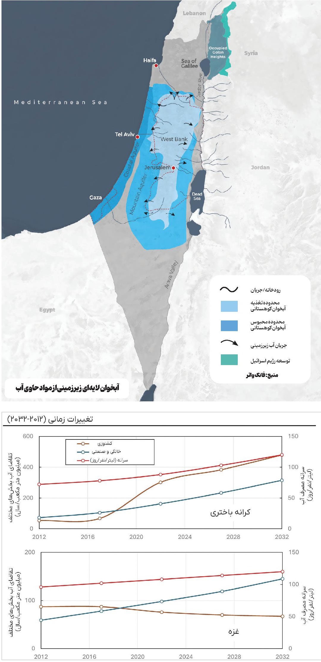 *برخی از دادههای این نمودارها مربوط به سالهای پیش از جنایتهای تازه رژیمصهیونیستی پس از هفت اکتبر است. بااینحال نشان داده شده که در سال ۲۰۲۰، سرانه مصرف آب در اسرائیل (۳۲۰ لیتر/نفر/روز) بسیار بالاتر از فلسطین (۸۲ لیتر) بود که این میزان در فلسطین کمتر از حداقل استاندارد سازمان بهداشت جهانی (۱۰۰ لیتر) است. دسترسی به آب نیز در کرانه باختری (۹۵درصد) بسیار بهتر از نوار غزه (۱۱درصد) است. پیشبینیها در آن سال و بدون درنظرگرفتن جنایتهای جدید نشان میدهند که تا سال ۲۰۳۲، تقاضای آب و سرانه مصرف در کرانه باختری افزایش مییابد، درحالیکه در نوار غزه، این مقادیر ثابت خواهند ماند و حتی کارشناسان معتقدند در دو سال اخیر نزولی هم بوده است.
