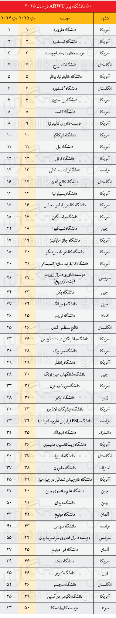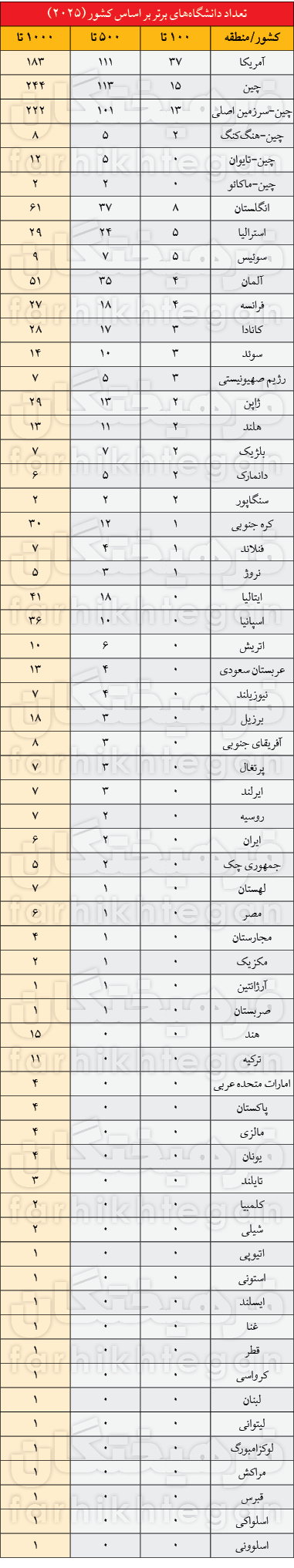 ۲۲۲ دانشگاه چینی در میان ۱۰۰۰ دانشگاه برتر قرار گرفتهاند؛ این تعداد بیش از دانشگاههای آمریکا با ۱۸۳ دانشگاه است و از لحاظ تعداد دست برتر با چینیهاست. بررسی کیفی اما حرف دیگری دارد، بیش از یکسوم (37 دانشگاه) 100 دانشگاه نخست رتبهبندی 2025 آمریکایی هستند درحالیکه چینیها 13 و انگلیسیها 8 دانشگاه در فهرست صدتایی برترینها دارند. از حیث مجموع تعداد دانشگاهها بعد از این سه کشور، آلمانیها با 51 موسسه قرار میگیرند. آنها همچنان چهار دانشگاه مونیخ (رتبه ۴۲)، فنی مونیخ (رتبه ۴۵)، هایدلبرگ (رتبه ۵۱) و بن (رتبه ۶۸) را در میان ۱۰۰ دانشگاه برتر دارند. ۳۵ دانشگاه این کشور هم در جمع ۵۰۰ دانشگاه برتر قرار گرفته است. ایتالیا با 41، اسپانیا با 36 و کره جنوبی با 30، استرالیا و ژاپن با 29 موسسه و کانادا با 28 دانشگاه 10 کشور با بیشترین تعداد دانشگاه در ARWU امسال به حساب میآیند.