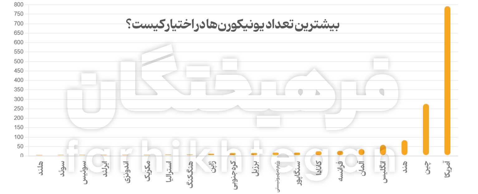 آمریکا با حدود 796 یونیکورن ثبتشده، بیشترین تعداد شرکتهای یونیکورن را به خود اختصاص داده است و از این رو، آمریکا سالانه بیشترین سهم از سرمایهگذاریهای خطرپذیر را دریافت میکند. در این بین، چینیها با دربرگرفتن 280 یونیکورن و با اختلافی فاحش، در رده دوم قرار میگیرند. باوجوداین، از جمع پنج شرکت یونیکورن بزرگ دنیا، 2 یونیکورن بزرگ چینی یعنی «بایتدنس» و «انت گروپ»هستند که جزء بزرگترین یونیکورنهای این فهرست بودهاند. به عبارتی، از جمع 10 شرکت برتر یونیکورن دنیا در سال 2025، نیمی از آنها، یعنی 5 شرکت آمریکایی بوده و دو شرکت هم هندی هستند. درمجموع، در 10 شرکت برتر یونیکورنی، 5 شرکت متعلق به آمریکای شمالی و 5 شرکت متعلق به منطقه آسیا حضور دارند.