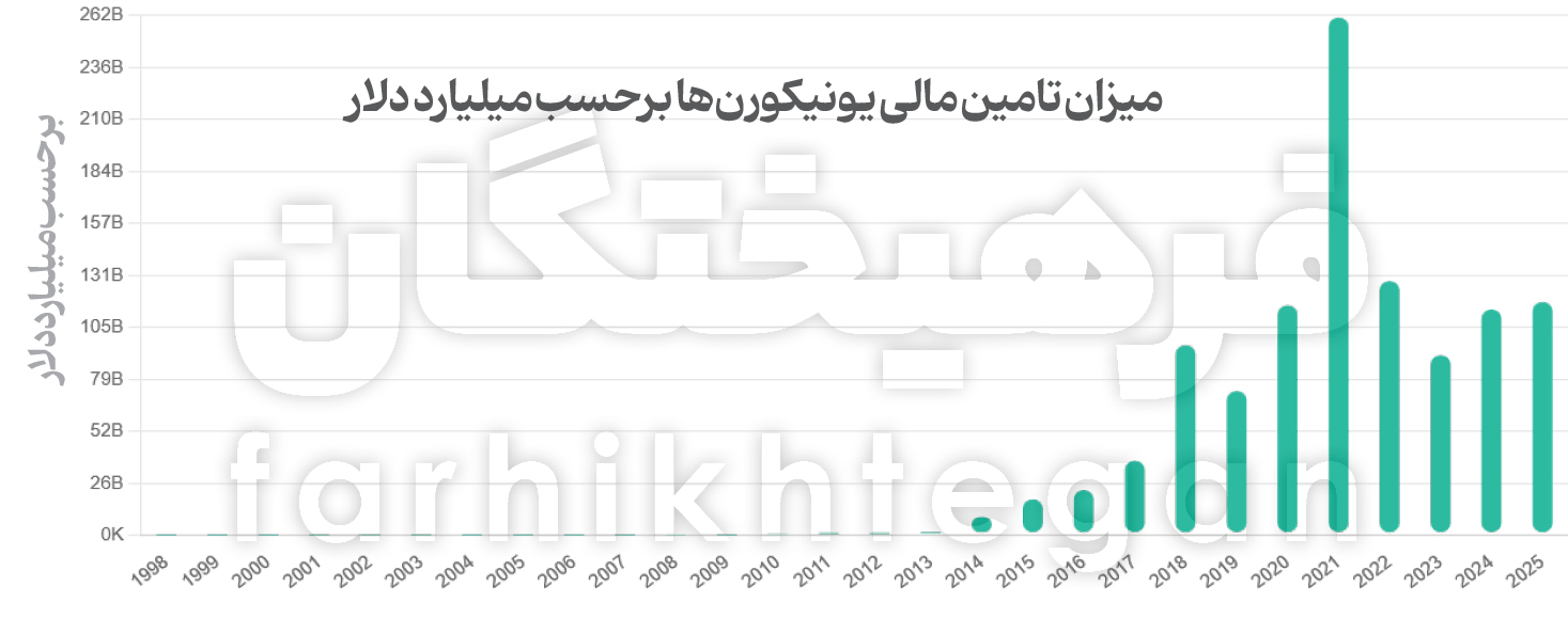 جایگاه ششمین یونیکورن برتر 2025 هم به شرکت چینی «شین» با ارزش 66 میلیارد دلار میرسد که در مقایسه با ارزش سال گذشته بدون تغییر باقی مانده اما از نظر رتبه، یک پله سقوط از رده پنجم در 2024 به رده ششم تنزل کرده است. کل سهام «شین» حدود 4 میلیارد دلار گزارش شده است. در این میان، یونیکورن آمریکایی «استریپ» که سال گذشته با ارزش 70 میلیارد دلار رتبه چهارم را از آن خود کرده بود، امسال با کاهش 7 درصدی به ارزش 65 میلیارد دلار رسیده و با سه پله سقوط به رده هفتم جدول برترین یونیکورنهای دنیا دست پیدا کرده است. کل سهام این شرکت در سال 2025 به حدود 9 میلیارد دلار رسید. رتبه هشتم جدول برترینهای امسال به شرکت آمریکایی «دیتابریکس» با ارزش 62 میلیارد دلار میرسد که از نظر ارزش در مقایسه با 55 میلیارد دلار سال گذشته، با رشد 13 درصدی روبهرو شده اما با دو پله سقوط، از رده ششم در سال 2024 به رده هشتم در 2025 دست یافته است. کل سهام این شرکت در سال جاری 16 میلیارد دلار برآورد شده است. شرکت آمریکایی «آنتروپیک» با ارزش 62 میلیارد دلاری در رده نهم برترین یونیکورنها جا خوش کرده که در مقایسه با سال 2024 با ارزش حدود 60 میلیارد دلاری، با رشد 3.5 درصدی همراه بوده و رده شرکت هم تغییری نکرده است. کل سهام آن هم 13 میلیارد دلار اعلام شده است. دهمین شرکت برتر یونیکورن دنیا هم شرکت هندی Reliance Jio است که ارزش 58 میلیارد دلاری را به خود اختصاص داده است. این یونیکورن در سال 2024 در ردهبندی برترین یونیکورنها حضور نداشته است و امسال بهعنوان دومین شرکت برتر هندی در جمع 10 یونیکورن برتر دنیا قرار گرفته است. کل سهام این شرکت بالغ بر 20 میلیارد دلار است. آنچه از ردهبندی شرکتهای برتر به دست آمده، نشان میدهد که کل رقم تأمین مالی شرکتهای یونیکورن فعلی در سال 2025 به چیزی بالغ بر 118 میلیارد و 900 میلیون دلار میرسد که در مقایسه با 2024 با 115 میلیارد دلار، با رشد 3.5 درصدی مواجه شده است. این در حالی است که بیشترین نرخ تأمین مالی یونیکورنها به سال 2021 و رقم 262 میلیارد و 200 میلیون دلار برمیگردد.
