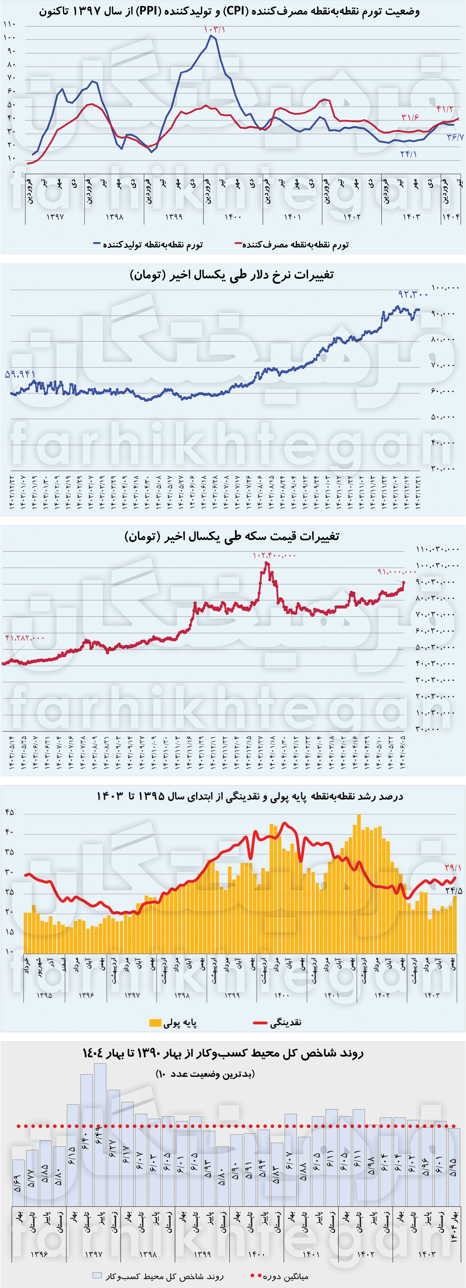 ازجمله مهمترین شاخصهای ارزیابی عملکرد دولتها، شاخص تورم است. در اغلب تحلیلها معمولاً در نقد عملکرد دولت از تورم مصرفکننده (CPI) نام برده میشود اما تورم تولیدکننده (PPI) هم به این دلیل که تورم پیشنگر بوده و تحولات آتی تورم مصرفکننده را تعیین میکند، بسیار مهم است. به عبارتی، تورم تولیدکننده با فاصله زمانی سه تا چندماهه خود را در تورم مصرفکننده به نمایش میگذارد. بررسی دادههای 8ساله (از ابتدای سال 1397 تاکنون) تورم نشان میدهد گرچه تورم فعلی از تورم سالهای 1399 و 1400 (دوره کرونا) کمتر بوده اما طی یک سال اخیر تورم نقطه به نقطه مصرفکننده از عدد 31.6 درصد در انتهای مرداد 1403 به 41.2 درصد در تیرماه امسال رسیده است. طی این مدت تورم تولیدکننده نیز از 24.1 درصد در انتهای مرداد سال گذشته به 36.7 درصد در خرداد سال جاری (آخرین آمار) رسیده است. درحال حاضر هر دو شاخص تورم بالاترین مقدار از انتهای سال 1402 تاکنون هستند. پرواضح است این تغییر و تحولات در متغیرهای اقتصادی ازجمله تورم و نرخ ارز درحالی است که طی یک سال اخیر کشور با تنشهای امنیتی و ژئوپلیتیکی، جنگ 12 روزه، شهادت رئیسجمهور و شهدای مقاومت روبهرو بوده و در این مدت آمریکا و حتی کشورهای غربی نیز طی اقدامات خصمانه خود، تحریمهای جدیدی را علیه کشورمان اعمال کرده و در تشدید انتظارات تورمی مؤثر بودهاند.
