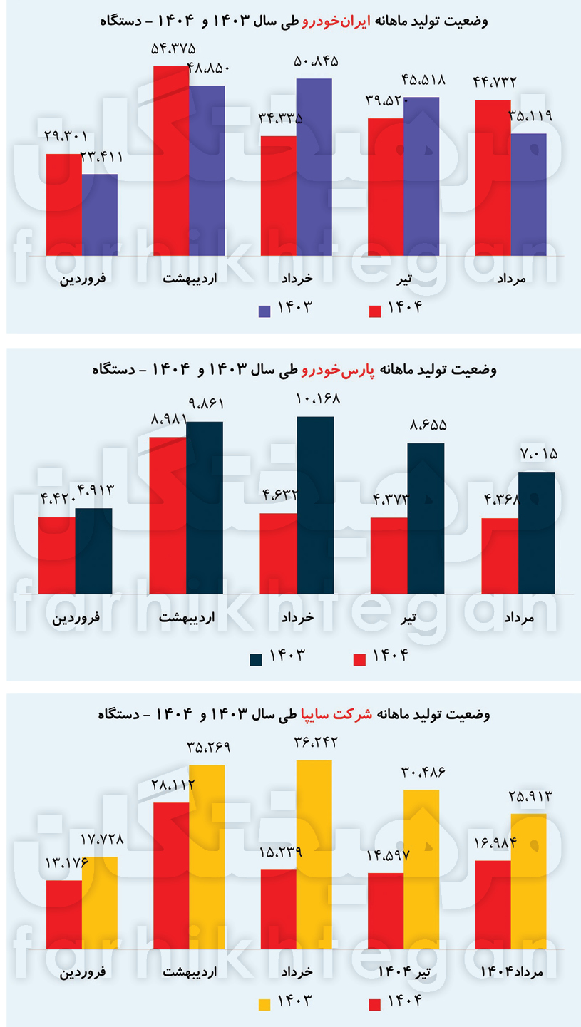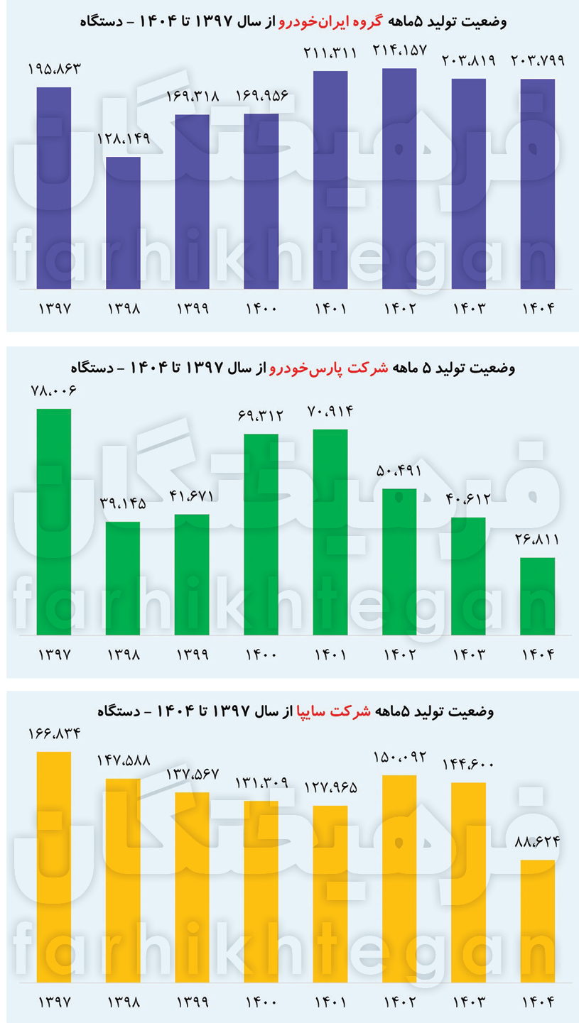 وضعیت تولید در ماههای دیگر چندان تعریفی ندارد و در ماههای دیگر تنها سایپا قادر به تولید 13 تا 15 هزار دستگاه خودرو بوده که نسبت به پنج ماه نخست سال گذشته حاکی از کاهش رشد در تولید خودرو است. سایپا در سال گذشته از اردیبهشت ماه تا مرداد ماه حدود 30 تا 35 هزار دستگاه خودرو تولید و تولید17 هزار دستگاه خودرو در فروردین 1403 را جبران کرد؛ اما امسال وضعیت تولید گروه سایپا چندان تعریفی ندارد. بررسی وضعیت تولید خودرو توسط گروه پارس خودرو نشان میدهد این گروه خودورساز به طور میانگین ماهانه فقط 4 هزار و 300 دستگاه خودرو تولید کرده درحالیکه در فروردین سال 1403، 5 هزار دستگاه خودرو تولید کرد و پس از آن تولید خود را افزایش داد تا جایی که از اردیبهشت تا مرداد 1403 این خودروساز حولوحوش 9 هزار دستگاه خودرو تولید کرده است. البته اوج تولید پارس خودرو در خرداد 1403 با 10 هزار دستگاه بود که پس از آن رفتهرفته تولید خودرو را کاهش داد، تا جایی که در مرداد پارسال تنها 7 هزار دستگاه خودرو تولید کرد که بازهم از میانگین تولید ماهانه پارس خودرو در این چند ماه بیشتر است.