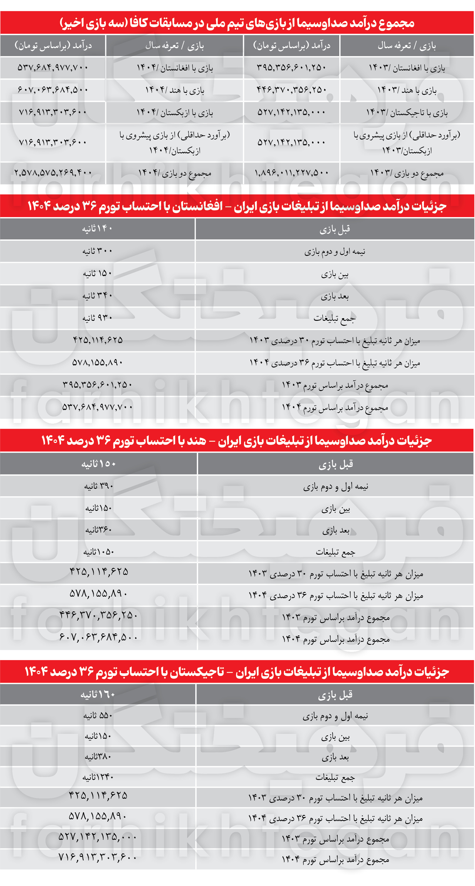 تساوی برای تاجیکستان برای ایران باخت است، اما شکی نیست با رقم 716 میلیارد قطعاً همین باخت برای تلویزیون برد به حساب میآید. از آنجایی که این بازی مهمترین بازی تیم ملی بود و در روز پنجشنبه هم برگزار میشد، تلویزیون توانست تبلیغ بیشتری بگیرد و مجموع تبلیغات این بازی به بیش از 20 دقیقه رسید و تنها زیرنویسهای نیمه اول و دوم بازی به 9.2 دقیقه میرسد. بنا بر رقم تورم در سال 1403 در آمد تلویزیون از این بازی به بیش از 527 میلیارد تومان و مجموع درآمد بر اساس تورم 1404 به 716.9 میلیارد تومان میرسد و این یعنی به اندازه ارزش کل ترکیب تاجیکستان، تلویزیون درآمد داشته است.