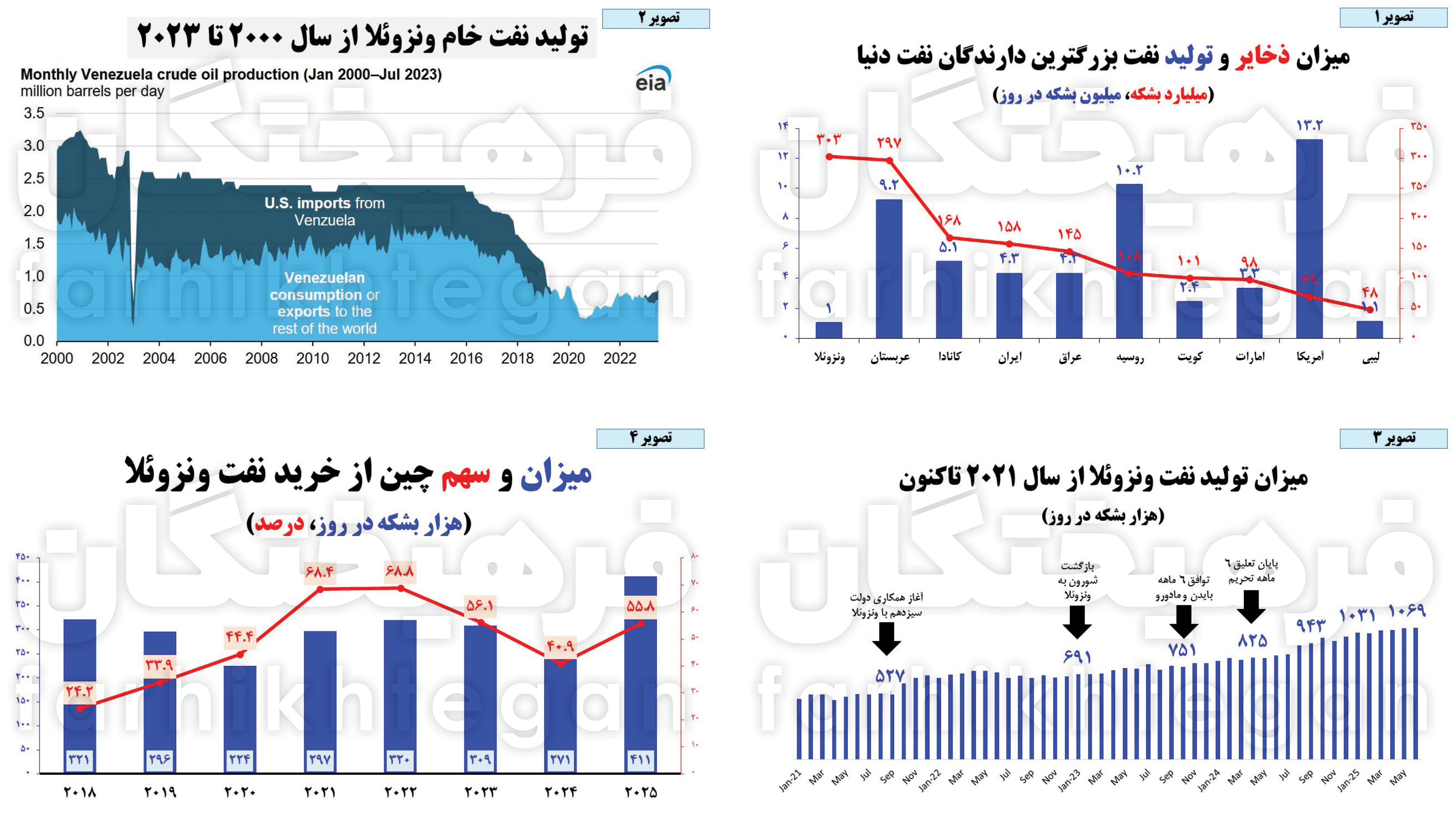 در تصویر 2، میزان تولید نفت ونزوئلا را از سال 2000 تا 2023 آورده شده است. قبل از انقلاب بولیواری در سال 1999، تولید نفت ونزوئلا روندی صعودی داشت ولی بعد از آن، روند تولید نفت این کشور نزولی شد و از بیش از 3 میلیون بشکه در روز به کمتر از 400 هزار بشکه در دوره اول ریاستجمهوری ترامپ رسید. رئیسجمهور فعلی ایالات متحده در دوره اول خود، در سال 2019 سیاست فشار حداکثری را علیه ونزوئلا اعمال کرد و با حذف نفت این کشور (و قبل از آن حذف نفت ایران) از بازار نفت، زمینه افزایش تولید نفت شیل آمریکا و صادرات آن را فراهم کرد و بدین ترتیب نفت شیل آمریکا، جایگزین نفت ونزوئلا و ایران شد. اما از سال 2021 و با روی کار آمدن دولت سیزدهم، ورق تولید نفت ونزوئلا برگشت و در سپتامبر همین سال، رویترز از توافق بزرگ نفتی بین ایران و ونزوئلا خبر داد که براساس آن، ایران با صادرات ماهانه 2 میلیون بشکه میعانات گازی خود به این کشور، به افزایش تولید نفت ونزوئلا کمک کرد.