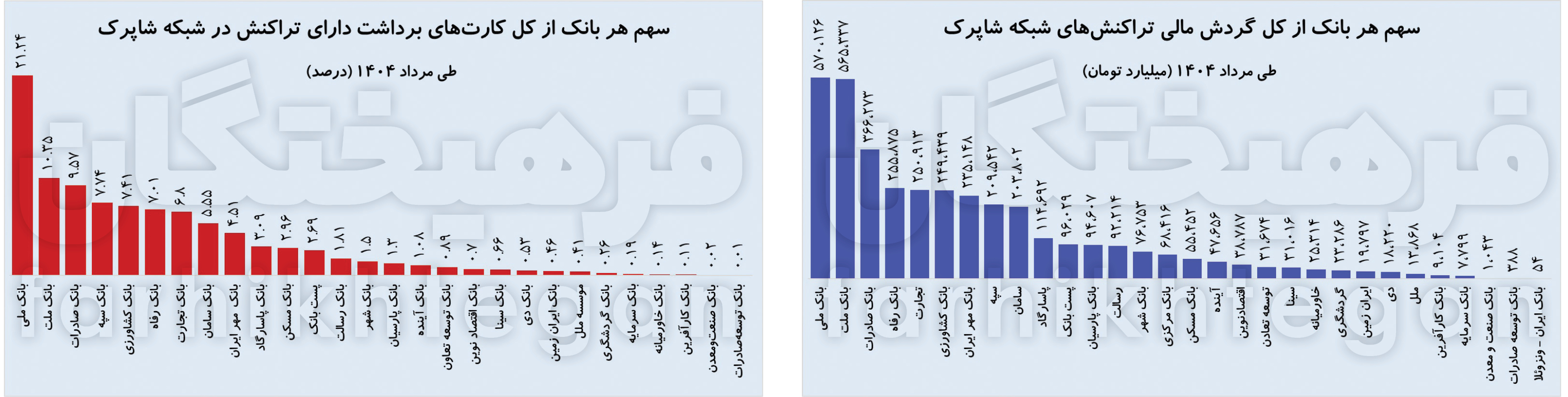 بررسی تازهترین آمارهای گزارش شبکه شاپرک از گردش مالی شبکه بانکی کشور در مرداد ۱۴۰۴ نشان میدهد بانکهای بزرگ دولتی همچنان سهم غالب را در تراکنشهای مالی کشور حفظ کردهاند. طبق این گزارش، بیش از ۵۷۰ هزار میلیارد تومان از تراکنشهای شبکه شاپرک مربوط به بانک ملی بوده و این بانک در صدر قرار دارد و پس از آن بانک ملت با حدود ۵۶۵ هزار میلیارد تومان در جایگاه دوم ایستاده است. این دو بانک رویهم نزدیک به نیمی از کل گردش مالی شبکه شاپرک را در مردادماه ۱۴۰۴ به خود اختصاص دادهاند. در رتبههای بعدی، بانک صادرات ایران با گردش ۳۶۶ هزار میلیارد تومان، بانک رفاه کارگران با ۲۵۵ هزار میلیارد تومان و بانک تجارت با رقمی مشابه قرار گرفتهاند. بانک کشاورزی و بانک قرضالحسنه مهر ایران نیز به ترتیب با گردش مالی ۲۵۰ و ۲۳۵ همتی نقش پررنگی در جابهجایی منابع مالی ایفا کردهاند. از میان بانکهای خصوصی و نیمهخصوصی، نامهایی چون سامان و پاسارگاد با گردشهای مالی ۲۰۳ و ۱۱۳ هزار میلیارد تومانی قابل توجه است؛ هرچند فاصله آنها با بانکهای دولتی بسیار زیاد است. همچنین، بانکهای کوچکتری مانند رسالت، شهر و پارسیان گردشهایی در حدود ۷۶ تا ۹۶ میلیارد تومان در ماه قبل ثبت کردهاند. بانک مرکزی نیز گردش مالی حدود ۶۸ میلیارد تومان در مردادماه داشته است. بانکهای سرمایه، کارآفرین و مؤسسه اعتباری ملل نیز کمترین گردشهای مالی را در ماه قبل داشتهاند که به ترتیب ۸، ۹ و ۱۳.۶ میلیارد تومان بوده است. در نهایت، بانکهای توسعهای مانند بانک صنعت و معدن، بانک توسعه صادرات ایران و بانک مشترک ایران-ونزوئلا با گردشهای بهترتیب حدود هزار، ۳۸۸ و ۵۴ میلیارد تومان، کمترین سهم را از گردش مالی در مردادماه به خود اختصاص دادهاند.