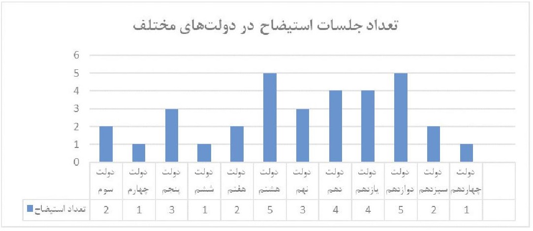 طبق قانون اساسی نمایندگان مجلس شورای اسلامی این اختیار را دارند که در موارد ضروری، هیئت وزیران یا هر یک از وزرا را مورد استیضاح قرار دهند. برای طرح استیضاح در مجلس، ارائه درخواستی با امضای حداقل ۱۰ نفر از نمایندگان الزامی است. هیئت وزیران یا وزیر مربوطه موظف است ظرف ۱۰ روز پس از مطرحشدن استیضاح، در مجلس حاضر شده و به سؤالات پاسخ داده و از مجلس درخواست رأی اعتماد مجدد کند. این فرایند هرچند نظارت بر عملکرد دولت و وزرا را توسط مجلس شورای اسلامی افزایش میدهد؛ اما به واسطه برخی از مسائل، منجر به کاهش اعتمادبهنفس و اطمینان مقام مسئول و شکلگیری نوعی رفتار محافظهکارانه توأم با راهبردی غیرتحولی شده و درنهایت به ضعف نهادین جایگاه وزارت منجر میشود. ثبت 33 مورد استیضاح از دولت سوم تا چهاردهم به نوعی این موضوع را اثبات میکند. نمودار زیر تعداد استیضاح در هر دولت را نشان میدهد که دولتهای هشتم و دوازدهم هر یک با پنج استیضاح از این نظر رکورددار هستند.