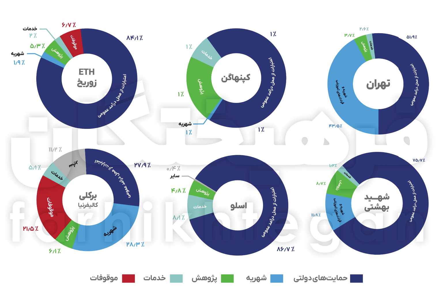 وقتی روند هزینهکرد دانشگاههای شهید بهشتی و تهران را در کنار 4 دانشگاه خارجی مدنظر این گزارش میگذاریم، به نکات قابلتوجهی میرسیم. با وجود اینکه همه آنها بیش از 50 درصد منابعشان را صرف حقوق و رفاهیات پرسنل میکنند، اما دانشگاههای خارجی سهمی بیش از 5 درصدی را برای استهلاک و کاهش ارزش داراییها در نظر میگیرند، سهمی که در دو دانشگاهی ایرانی عملاً صفر است، موضوعی که باعث شده تا امروز تعمیر و تجهیز ساختمانهای قدیمی این دو دانشگاه ایرانی نیازمند تخصیص ردیف بودجه قابل توجهی باشد. در مقابل باید به این مسئله هم اشاره کرد که پژوهش و توسعه فناوری با وجود اینکه سهم 22 و 13 درصدی در دانشگاههای تهران و شهید بهشتی دارند، اما به جز دانشگاه برکلی کالیفرنیا که 13 درصد از منابعش را در قالب پژوهانه پردیس برکلی هزینه میکند، عملاً دیگر دانشگاهها بودجه جداگانهای برای این حوزه در نظر نگرفتهاند. جالبتر اینکه دو دانشگاه زوریخ و برکلی کالیفرنیا به ترتیب 6 و 3.5 درصد از منابع مالی خود را صرف بورسیه و کمکهزینههای تحصیلی میکنند.