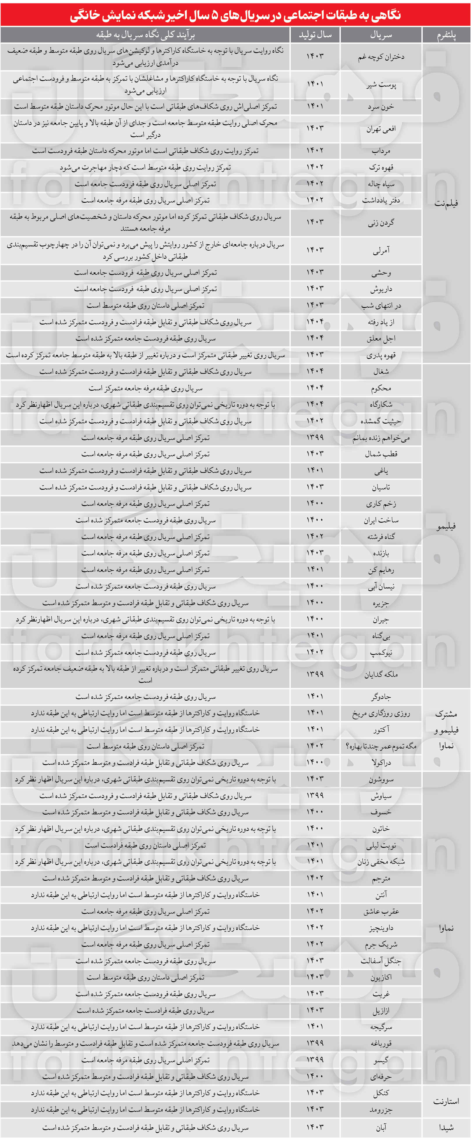 در این گزارش از سال 1399 تا سال 1404 به تولیدات چهار پلتفرم شناختهشده (فیلیمو، نماوا، فیلمنت و استارنت) پرداختهایم. در این پنج سال، بیش از 60 سریال ساخته شده است. در این میان، بخش قابلقبولی از این تولیدات موردتوجه مخاطبان قرار گرفتند و مردم انتخاب کردند تا آن را ببینند. اما طبقه متوسط کجای این تولیدات بود؟