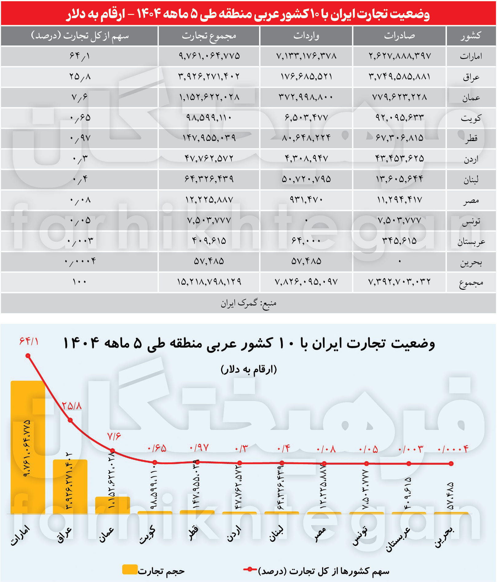 آمارهای گمرک ایران نشان میدهد طی ۵ ماه نخست امسال، حجم تجارت دوجانبه ایران با کشورهای عربی نزدیک به ۱۵.۲ میلیارد دلار بوده است که سهم قابل توجهی از آن به دو کشور عراق و امارات اختصاص دارد. امارات با حدود ۹.۸ میلیارد دلار و عراق با حجم تجارت تقریبی ۳.۹ میلیارد دلار بزرگترین شرکای تجاری ایران در منطقه هستند و نقش کلیدی در تبادلات اقتصادی ایران ایفا میکنند. سهم این دو کشور از تجارت ۱۵.۸ میلیارد دلاری ایران با ۱۰ کشور عربی در ۵ ماه نخست امسال حدود ۹۰ درصد بوده است.