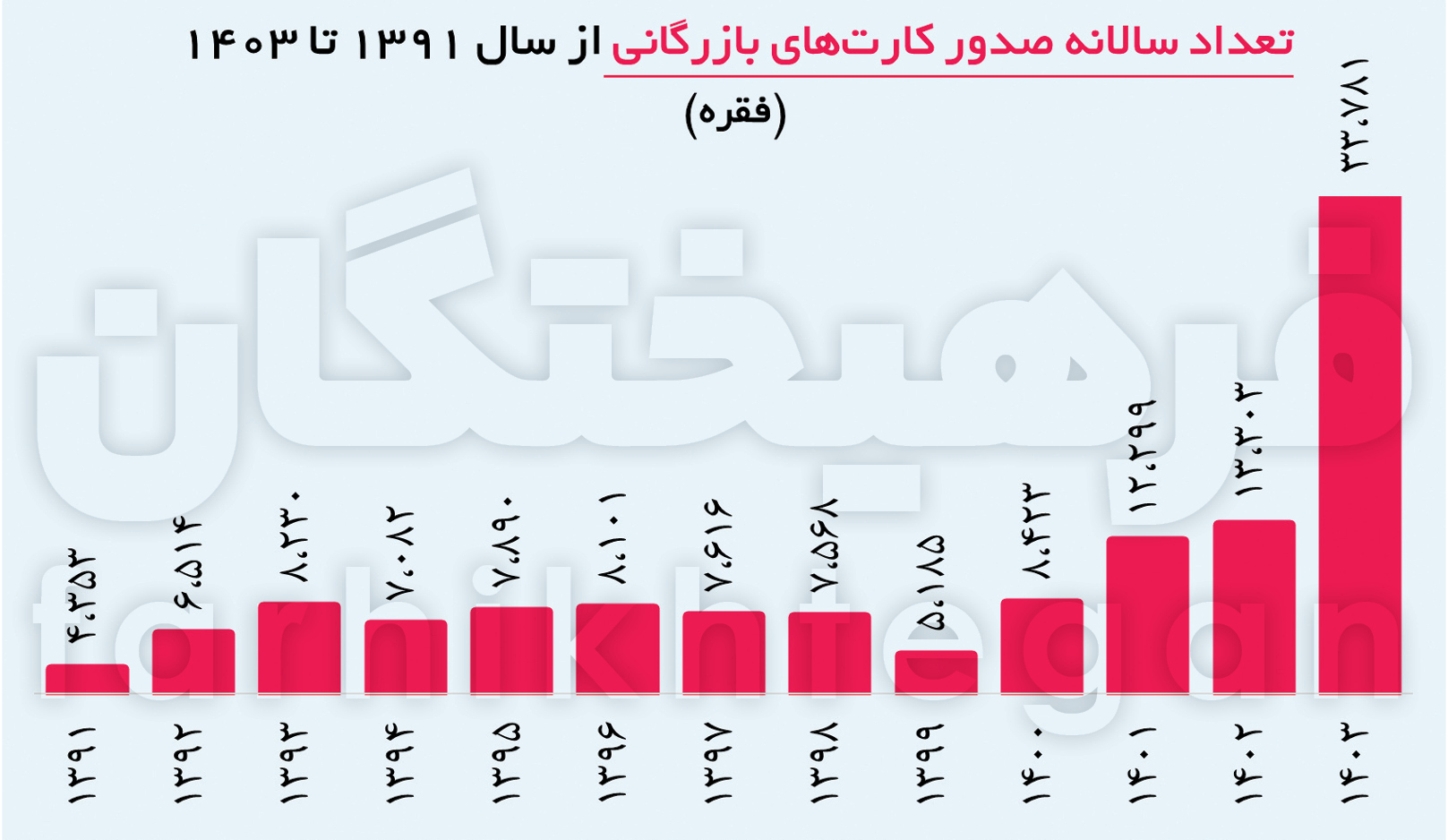 آنطور که در نمودار گزارش حاضر آمده، طی سال گذشته 33 هزار و 781 فقره کارت بازرگانی صادر شده که نسبت به سال 1402 و 1401 رشد 2.5 برابری داشته است. همچنین این تعداد نسبت به تعداد کارتهای صادرشده در سالهای 1391 تا 1400 که به طور میانگین 7 تا 8 هزار فقره بوده، رشد 4.2 برابری داشته است.