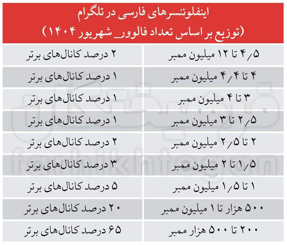 با وجود گذشت پنج سال از فیلترینگ پیامرسان تلگرام در ایران، با این حال آمارها حاکی از این است که تلگرام به عنوان یکی از اصلیترین پیامرسانها در فضای مجازی ایران نقش تأثیرگذاری در اطلاعرسانی اخبار و سرگرمی مخاطبان، آموزش و بازاریابی دارد. توجه کاربران به کانالهای پرمخاطب در این اپلیکیشن نشان میدهد عمده کانالها در بازه 200 تا 500 هزار مخاطب قرار دارند. کانالهای بالای دو میلیون مخاطب نیز در این اپلیکیشن برخلاف اینستاگرام بسیار کمتر بوده و به نوعی تعداد مخاطبان بالای 500 هزار نفر بسیار محدود و انحصاری در دست تنها چند نفر قرار دارند و همین مسئله باعث شده تا تعداد کانالهایی که مخاطبان میلیونی دارند در این بستر بسیار محدود باشد. اطلاعات منتشر شده از وضعیت کاربران و اینفلوئنسرهای تلگرام حاکی از این است که تمرکز اصلی کاربران بر کانالهایی است که مخاطبان میلیونی نداشته و ندارند، به این ترتیب بیشترین و عمدهترین سهم کانالها مربوط به بازه 200 تا 500 هزار عضو بوده است. در رده بعدی اما کانالهای بین 500 هزار تا یک میلیون نفر قرار دارند. الگوی مخاطبان کانالها در تلگرام همانند اینستاگرام هرمی شکل بوده و نشان میدهد تعداد کمی کانال فوقالعاده بزرگ در رأس هرم قرار دارند، درحالیکه اکثر کانالها در دستههای چند صد هزار نفری متمرکز هستند. موضوعاتی که در این کانالها مورد توجه قرار گرفته است برخلاف اینستاگرام اکثراً موضوعات هدفمند و تخصصی بوده است و یا موضوعاتی بودهاند که جامعه وفاداری از دنبالکنندگان را به خود جذب کردهاند.