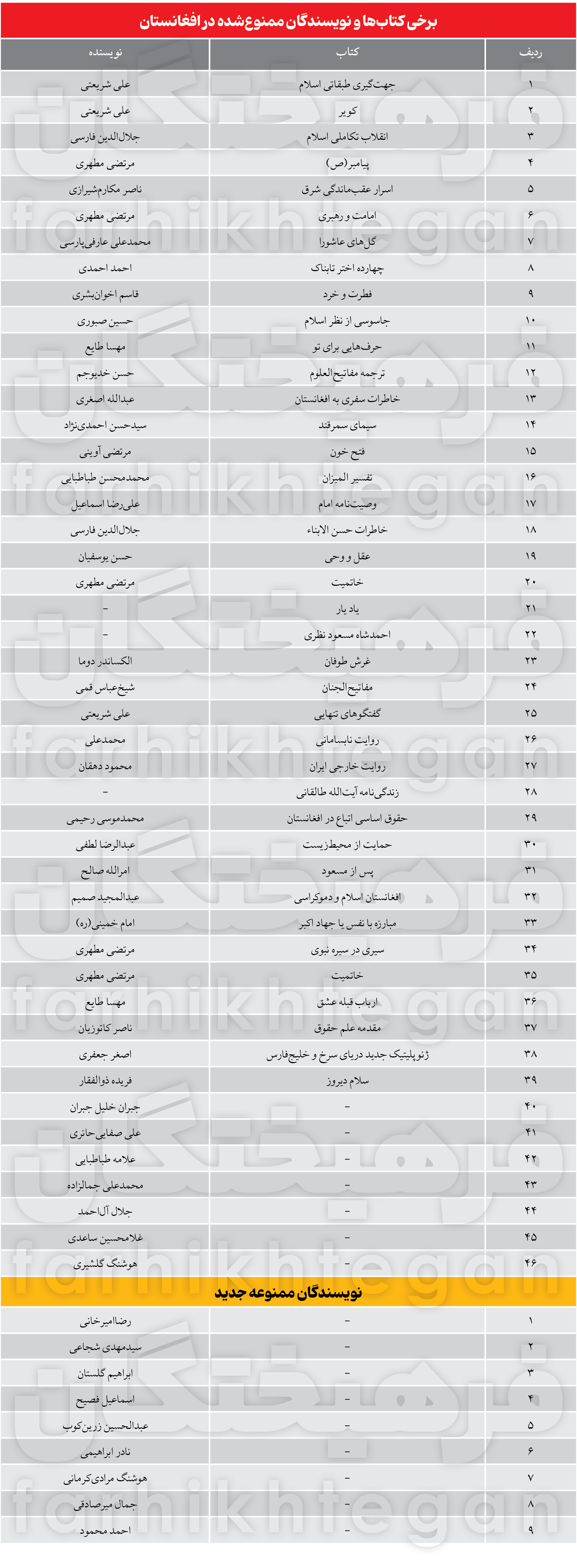این کتابفروش هراتی وقتی به فهرست تازه طالبان اشاره میکند، نفسش را با سنگینی بیرون میدهد و میگوید: «اسمهایی در لیست هست که حتی شنیدنش هم آدم را شوکه میکند. هوشنگ گلشیری، رضا امیرخانی، ابراهیم گلستان، اسماعیل فصیح، سیدمهدی شجاعی، عبدالحسین زرینکوب، نادر ابراهیمی، هوشنگ مرادیکرمانی، احمد محمود و جمال میرصادقی... طالبان همه اینها را ممنوع کردهاند. از رمان و داستان گرفته تا آثار تاریخی و دینی. شما ببینید، وقتی نویسندهای مثل مرادیکرمانی که قصههای کودکانه و شیرین نوشته هم در لیست ممنوعه قرار میگیرد، یعنی دیگر هیچ منطقی در کار نیست.»