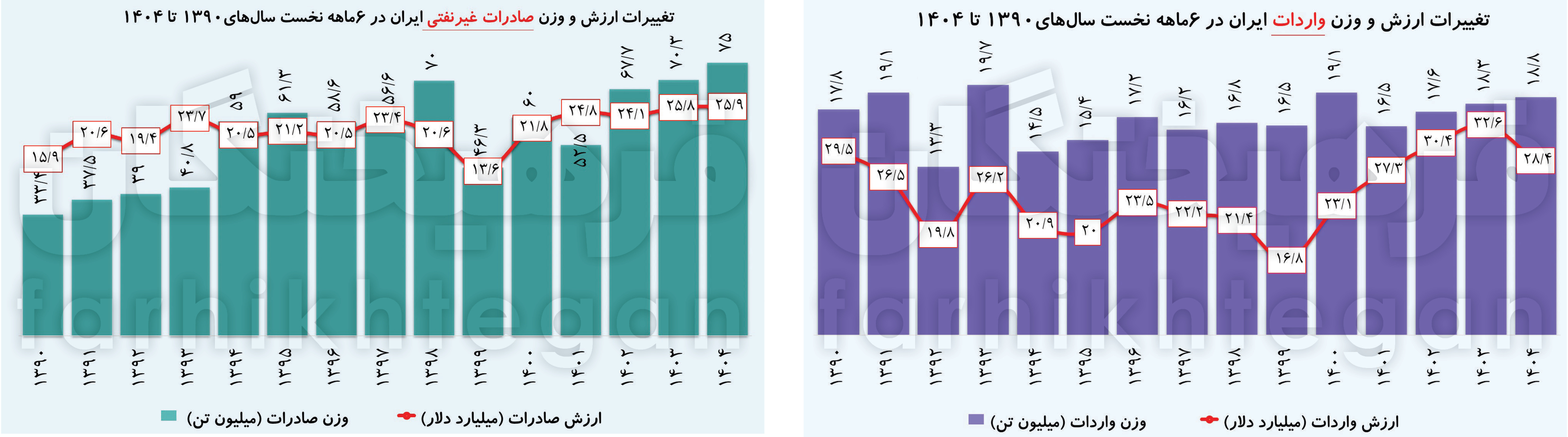 روز گذشته فرود عسگری، معاون وزیر اقتصاد و رئیس کل گمرک ایران آخرین دادههای مربوط به تجارت خارجی ایران در نیمه اول سال جاری را اعلام کرد. براساس اعلام رئیس گمرک، در نیمه نخست امسال ۲۵ میلیارد و ۹۴۴ میلیون دلار انواع کالای غیرنفتی از کشورمان صادر و به میزان ۲۸ میلیارد و ۳۶۷ میلیون دلار وارد کشور شد. به گفته عسگری میزان وزنی کالاهای صادراتی در این مدت ۷۴ میلیون و ۹۹۷ هزار تن و میزان وزنی واردات ۱۸ میلیون و ۷۵۷ هزار تن بوده است.