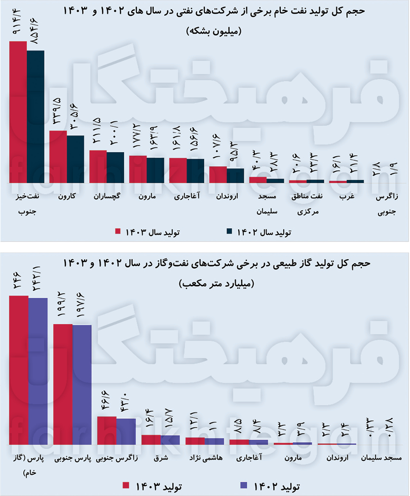 طبق بررسی «فرهیختگان» از صورتهای مالی شرکتهای بزرگ تولیدکننده نفت و گاز کشور؛ طی سال گذشته تولید این شرکتها بهطور میانگین حدود ۱۰ درصد افزایش یافته است. در بزرگترین شرکت تولیدکننده نفت کشور که سهم ۷۵ درصدی از کل تولید کشور را در دست دارد، ۹۱۴ میلیون بشکه در کل سال یا به عبارتی ۲ میلیون و ۶۳۱ هزار بشکه در روز بوده است. این عدد نسبت به سال ۱۴۰۲ افزایش ۷ درصدی داشته است. در شرکت نفت کارون این عدد ۳۳۹ میلیون بشکه برای کل سال یا ۹۳۱ هزار بشکه در روز بوده که نسبت به سال ۱۴۰۲ افزایش ۱۰ درصدی داشته است. همچنین طی سال گذشته تولید در نفت گچساران ۵.۷ درصد، در مارون ۸.۱ درصد، در آغاجاری ۳.۳ درصد و در اروندان ۱۳ درصد افزایش یافته است.