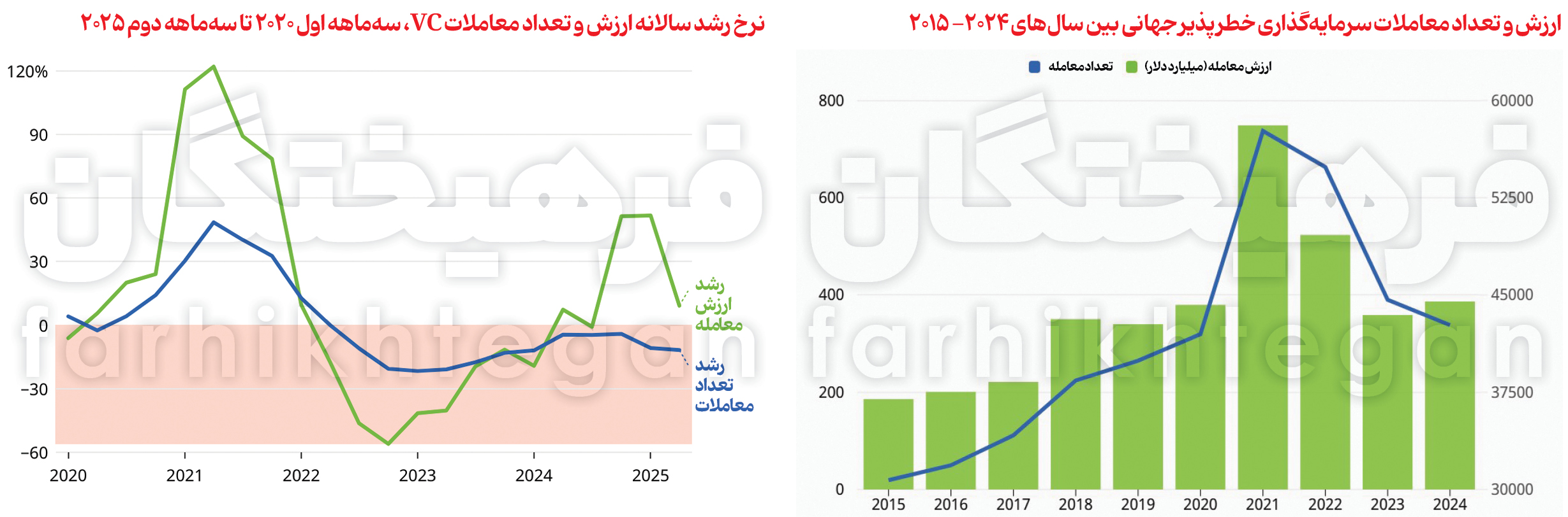 در مقابل، تعداد معاملات VC از سهماهه دوم 2022 بهطور پیوسته رو به کاهش بوده و در سهماهه دوم 2025 کاهش 11 درصدی نسبت به سال قبل را ثبت کرده است.