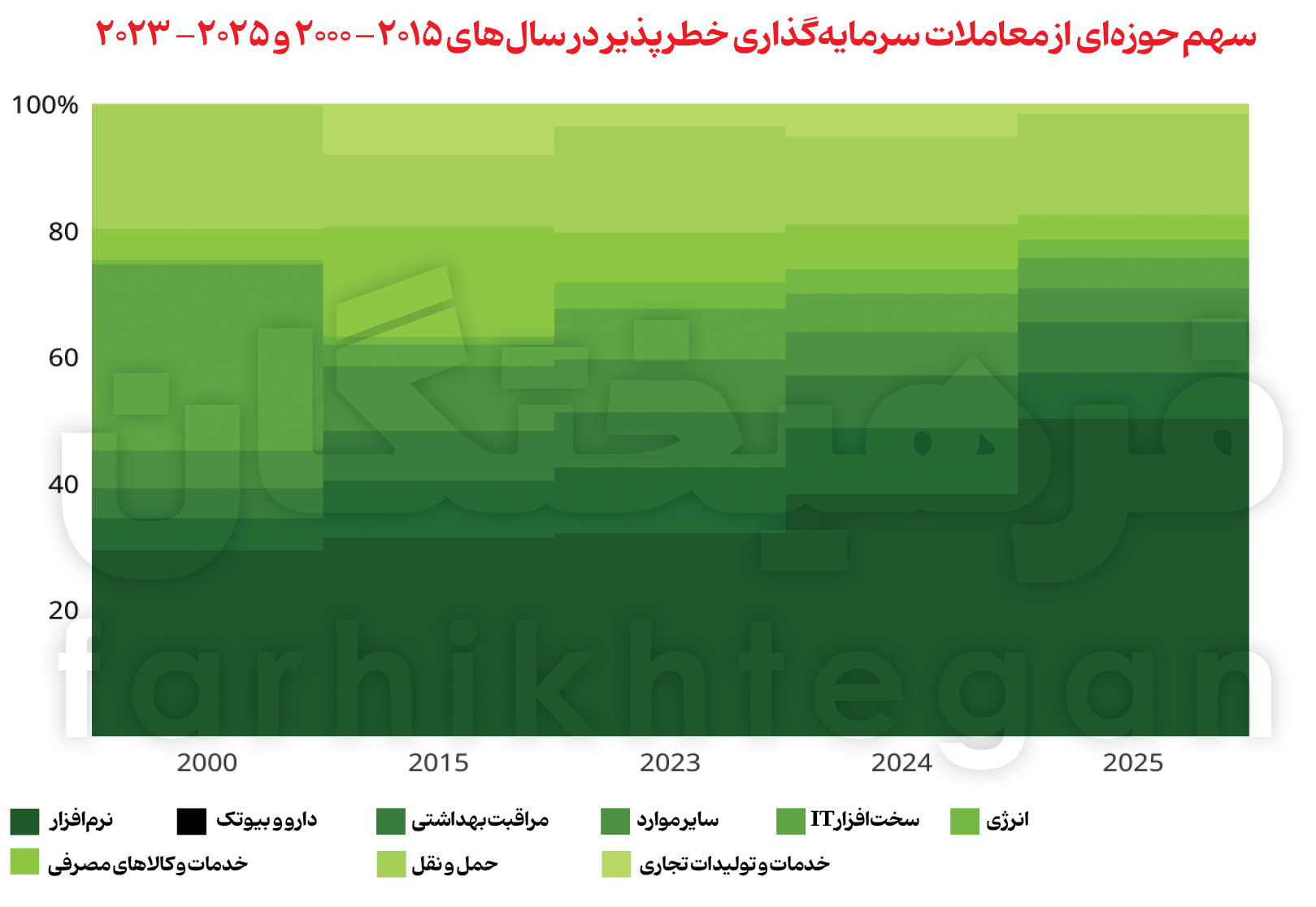 از سال 2000 تا 2023، سرمایهگذاریهای خطرپذیر بهطور چشمگیری در بخشهای مختلف ظاهر شدهاند. در این دوره، سختافزار فناوری اطلاعات شاهد کاهش قابلتوجهی در سهم خود از کل ارزش معاملات سرمایهگذاری خطرپذیر بود، در حالی که بخشهایی مانند انرژی و مراقبتهای بهداشتی سهم بیشتری از سرمایهگذاریها را به خود اختصاص دادند. در عین حال، بخش نرمافزاری سهم پایدار 30 درصدی خود را در سرمایهگذاریهای خطرپذیر حفظ کرد.