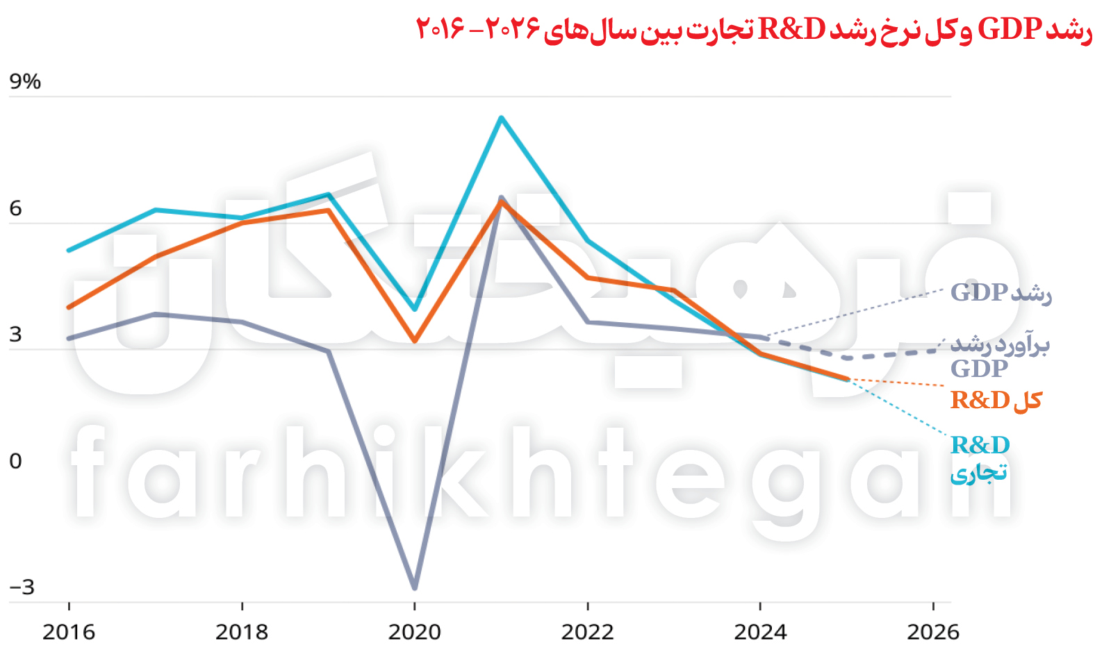 برآوردها برای سالهای ۲۰۲۴ و ۲۰۲۵، براساس رشد پیشبینیشده تولید ناخالص داخلی، سناریویی حتی بدتر را نشان میدهد؛ زیرا انتظار میرود رشد تحقیق و توسعه جهانی در سال ۲۰۲۴ به کمتر از ۳ درصد و در سال ۲۰۲۵ به تنها ۲ درصد کاهش یابد. به همین ترتیب، پیشبینی میشود تحقیق و توسعه تجاری روند کندتری را پیش گیرد و با نرخی مشابه کل تحقیق و توسعه رشد داشته باشد؛ به این معنی که با توجه به حذف چین و آمریکا از پیشبینیها، ۲.۹ درصد در سال ۲۰۲۴ و ۲.۳ درصد در سال ۲۰۲۵ رشد کند. اگر این برآوردها صحیح باشد، پایینترین نرخ رشد ثبتشده از سال ۲۰۱۰ رقم خواهد خورد. رشد تحقیق و توسعه تجاری نیز در همان سطح نرخ رشد کل هزینههای تحقیق و توسعه خواهد بود؛ وضعیتی که از اوایل دهه ۲۰۰۰ مشاهده نشده است. رشد هزینههای تحقیق و توسعه نیز بسیار پایینتر از رشد تولید ناخالص داخلی خواهد ماند، وضعیتی که آخرینبار در سال ۲۰۱۰ رخ داد.