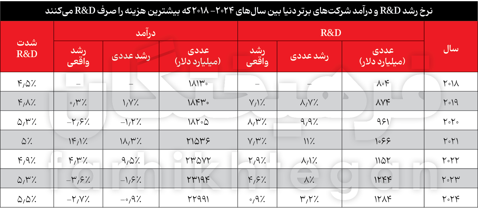در سال ۲۰۲۴، هزینههای تحقیق و توسعه شرکتها بهطور تقریبی به یک هزار و ۳۰۰ میلیارد دلار رسید که رکوردی تاریخی به شمار میآمد. این رقم حدود ۳ درصد رشد داشته، اما به دلیل تداوم تورم رو به بالا، از نظر واقعی تنها حدود یک درصد افزایش یافته است. با وجود آنکه این رقم بهصورت مطلق یک اوج تاریخی را نشان میدهد، اما کندترین رشد جزئی سالانه در هزینههای تحقیق و توسعه شرکتها از سال ۲۰۱۰ را رقم زده است. آمار سال ۲۰۲۴ نیز کاهش رشد واقعی ۴.۶ درصدی ثبتشده در سال ۲۰۲۳ را نشان میدهد. رشد ضعیف سرمایهگذاری در تحقیق و توسعه در کنار کاهش درآمد کل شرکتهای چندملیتی بزرگ و تحقیقوتوسعهمحور رخ داده است. در سال ۲۰۲۴، درآمد ترکیبی این شرکتها حدود یک درصد بهصورت اسمی و ۲.۷ درصد بهصورت واقعی کاهش یافت. این آمار، دومین سال متوالی رشد منفی درآمدی را نشان میدهد.