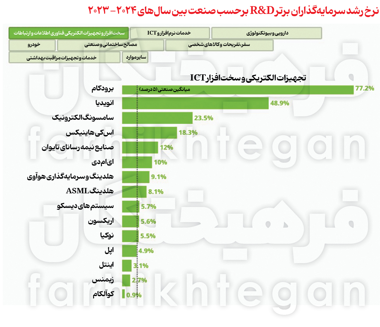 اما آنچه باید به آن توجه کرد، این است که در بخش سختافزار و تجهیزات الکتریکی فناوری اطلاعات و ارتباطات، شرکت «برادکام» بیشترین رشد را با 77.2 درصد ثبت کرده و پس از آن انویدیا، سامسونگ الکترونیکس و «اسکی هاینیکس» قرار گرفتهاند. همچنین، «متا» همچنان در بخش نرمافزار و خدمات فناوری اطلاعات و ارتباطات با نرخ رشد 14 درصد پیشتاز است. علاوه بر این، در بخش داروسازی و بیوتکنولوژی، شرکت AbbVie با افزایش 67 درصدی بسیار بالاتر از سایر شرکتهای این حوزه مانند Bristol-Myers Squibb با رشد 20 درصدی و آسترازنکا با رشد 19 درصدی قرار گرفته است.