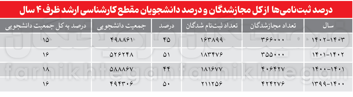 برای درک بهتر این موضوع بد نیست دو آمار تعداد ثبتنامشدگان و دانشجویان سال تحصیلی 1403-1402 این مقطع را ملاک قرار دهیم، بهطوریکه سال 1403 از کل ثبتنامشدگان فقط 15 درصدشان برای این مقطع بودهاند و در مقابل از 3 میلیون و 351 هزار و 877 دانشجو هم 15 درصدشان یا به عبارت دقیقتر 498 هزار و 861 نفر در این مقطع مشغول به تحصیل بودند.