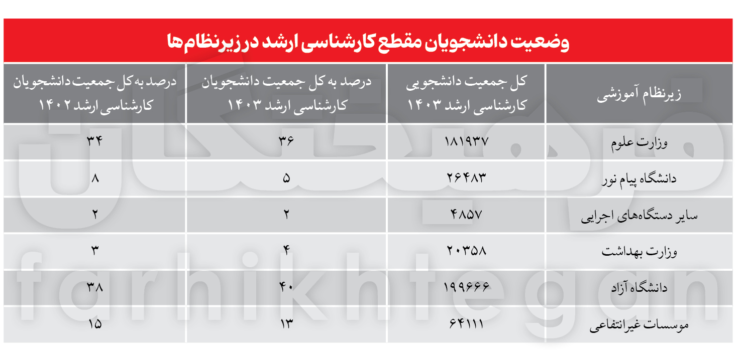 تقسیمبندی تحصیل زیرنظامهای آموزشی به دولتی و غیردولتی نشان میدهد سهم غیردولتیها از تربیت دانشجویان کارشناسی ارشد در سال 1403-1402، ۵۲ درصد و در مقابل دولتیها ۴۸ درصد بوده است. در این میان، دانشگاه آزاد بهتنهایی در سال دو سال قبل تحصیلی ۱۹۹ هزار و ۶۶۶ دانشجوی کارشناسی ارشد داشت که نشان میدهد ۴۰ درصد از کل جمعیت کارشناسی ارشد کشور در این دانشگاه تحصیل میکردند. وقتی این رقم را در کنار سهم ۳۸ درصدی سال ۱۴۰۲ قرار میدهیم، نشاندهنده افزایش ۲ درصدی اقبال به تحصیل در این دانشگاه است.