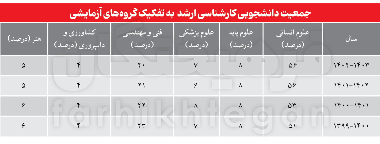 بررسی وضعیت چهار سال گذشته جمعیت دانشجویی در گروههای آزمایشی مختلف در مقطع کارشناسی ارشد نشان میدهد که سال 1403-1402 در مجموع ۵۶ درصد از جمعیت این مقطع در گروه علوم انسانی تحصیل میکردند؛ سهمی که در سال تحصیلی 1402-1401 نیز همین رقم بود و در مقایسه با یک سال قبلتر (۱۴۰۱-۱۴۰۰) با رشد ۳ درصدی همراه بوده است. از طرف دیگر در سال ۱۳۹۹ نیز ۵۱ درصد از کل جمعیت آن سال، یعنی ۲۵۰ هزار و ۳۳۰ نفر در علوم انسانی تحصیل میکردند.