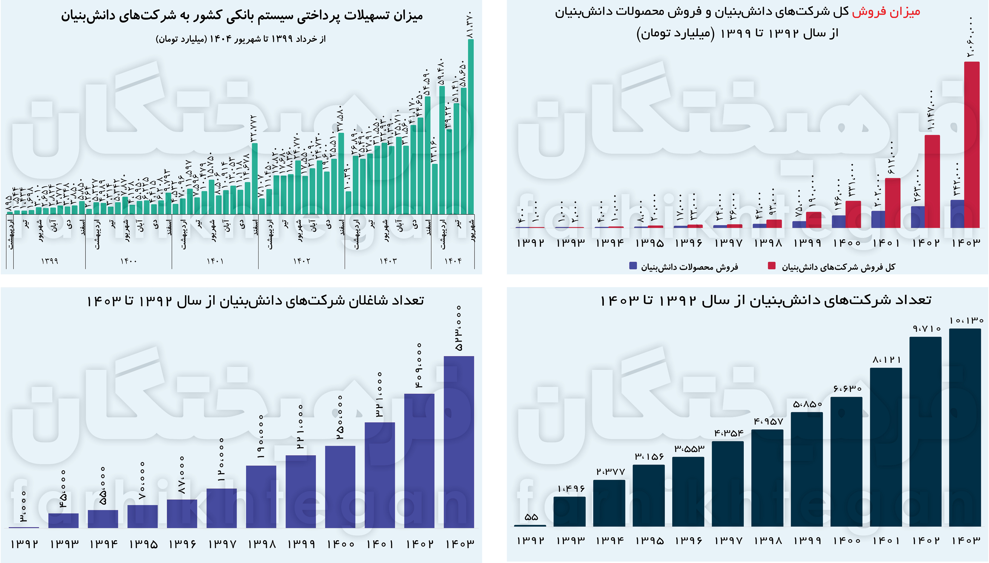 طبق دادههای بانک مرکزی ایران، حجم تسهیلات اعطایی به شرکتهای دانشبنیان در انتهای ۶ماهه نخست امسال به بیش از 313 همت رسیده که نسبت به رقم 155 همتی در نیمه نخست سال 1403 رشد 1002 درصدی داشته است. مقایسه این اعداد در مدت مشابه سالهای 1399 تا 1404 نشان میدهد در نیمه نخست سالهای مذکور رقم تسهیلات شرکتهای دانشبنیان به ترتیب 9.3 همت، 29 همت، 57 همت، 97 همت، 155 و 313 همت بوده است. همچنین نگاهی به تسهیلات ماهانه شرکتهای دانشبنیان نشان میدهد این عدد از 900 تا 1500 میلیارد تومان در سال 1399 به حدود 81 همت در شهریور امسال رسیده است؛ اما نگاهی به ارزش دلاری تسهیلات پرداختی بانکها به شرکتهای دانشبنیان نیز نشان میدهد ارزش دلاری این تسهیلات در ۶ماهه نخست سالهای 1399 تا 1404 به ترتیب 406 میلیون دلار، 1.2 میلیارد دلار، 2 میلیارد دلار، 2 میلیارد دلار، 2.2 میلیارد دلار و 3.4 میلیارد دلار بوده است. به عبارت دیگر، گرچه ارزش حقیقی تسهیلات پرداختی به شرکتهای دانشبنیان در دسترس نیست؛ اما آمارها نشان میدهد ارزش دلاری این تسهیلات روند رو به رشدی طی سالهای 1399 تا 1404 داشته است. دادههای بانک مرکزی نشان میدهد تسهیلات اعطایی به شرکتهای دانشبنیان در نیمه نخست سال جاری به 1936 شرکت تعلق گرفته است. این تعداد در مدت مشابه سال گذشته به 1998 شرکت تعلق گرفته بود.