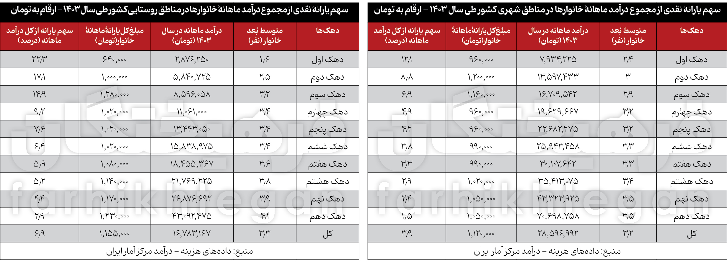 در مناطق شهری نیز درحالیکه سهم یارانه نقدی از کل درآمد خانوار طی سال 1403 در استانهای سیستانوبلوچستان، ایلام، لرستان، آذربایجان غربی، کرمان و کرمانشاه به ترتیب 7.3 درصد، 6.1، 5.8 و 5.7 درصد بوده، این عدد در تهران 2.6 درصد، مازندران و چهارمحالوبختیاری هرکدام 3.3 و در استان گیلان و البرز 3.5 درصد بوده است.