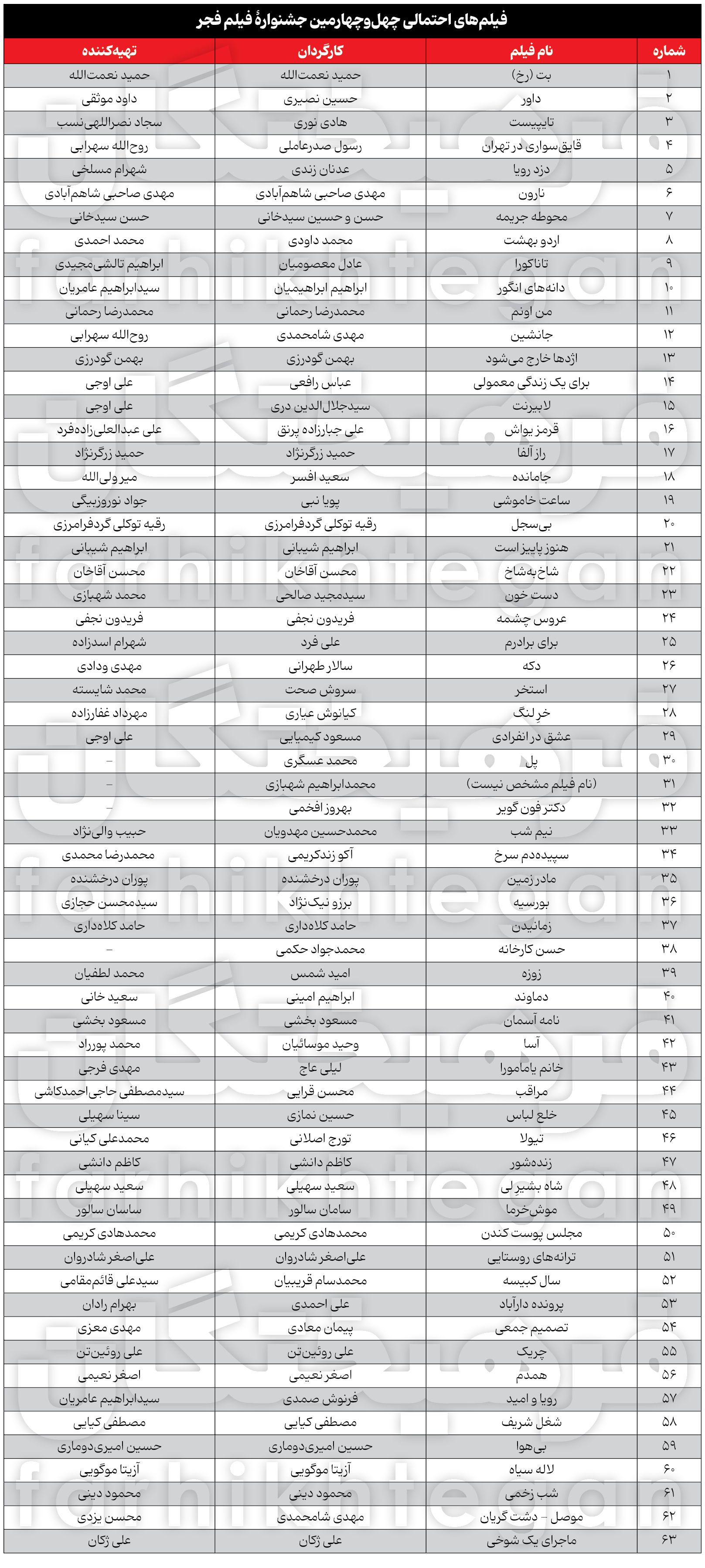 کیانا تصدیقمقدم، خبرنگار گروه فرهنگ: سه ماه تا آغاز چهلوچهارمین جشنواره فیلم فجر باقی مانده است؛ رویدادی که هر سال نهتنها ویترین اصلی سینمای ایران به شمار میرود، بلکه نبض جریانهای تازه فیلمسازی را نیز در دست دارد. امسال نیز همچون سالهای گذشته، به سراغ بررسی فیلمهای احتمالی این دوره رفتهایم. بر اساس اطلاعات «فرهیختگان»، حدود ۶۳ فیلم در حال ساخت امکان حضور در جشنواره فیلم فجر را دارند و باید دید با نظر هیئت انتخاب، کدام آثار به این جشنواره راه پیدا میکنند.