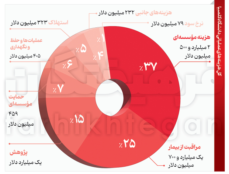 هزینهها، منعکسکننده هزینههای پرسنلی و غیرپرسنلی برای اداره مؤثر دانشگاه هستند و در سال 2025، هزینههای قابلتوجهی برای حمایتهای خارجی افزایش یافت. کل هزینههای عملیاتی برای سال مالی 2025 دانشگاه کلمبیا رقمی حدود 6 میلیارد و 600 میلیون دلار برآورد شده که 5.3 درصد در مقایسه با سال 2024 افزایش نشان میدهد. بهعبارتی، کل هزینههای عملیاتی دانشگاه چیزی حدود 706 هزار و 200 میلیارد تومان میشود که معادل 706.2 همت است. بزرگترین سهم از هزینههای دانشگاهی را در حدود 37 درصد، آموزش و مدیریت آموزشی تشکیل میدهد که رقمی بالغ بر 2 میلیارد و 500 میلیون دلار بوده و شامل هزینههای ارائه دورهها و برنامههایی است که مؤسسه آموزشی کلمبیا و نیز خدماتی مانند مشاوره شغلی را در برمیگیرد که به دانشجویان ارائه میشود. مازاد هزینهها از فعالیتهای کلیدی دانشگاه مانند مراقبت از بیمار با رقم یک میلیارد و 700 میلیون دلار، سهم 25 درصدی را از آن خود کرده است. در این میان، حدود یک میلیارد دلار از کل هزینههای دانشگاه که سهم 15 درصدی را به خود اختصاص میدهد، صرف پژوهشهای دانشگاهی میشود که حدود 107 هزار میلیارد تومان معادل 107 همت است. همچنین، هزینههای حمایت از زیرساختهای مؤسساتی نیز 459 میلیون دلار و سهم 7 درصدی را به خود اختصاص میدهد. درمجموع، اگر تمام بخشهای شامل پرداخت نیروی انسانی (آموزش، پژوهش، درمان و پشتیبانی) را در کنار هم در نظر بگیریم، هزینههایی که صرف پرداخت حقوق، دستمزد و مزایا میشوند، دوسوم کل هزینههای دانشگاه را تشکیل میدهند که چیزی حدود 4 میلیارد و 400 میلیون دلار از کل هزینهها میشود. در این میان، عملیات و حفظ و نگهداری با 405 میلیون دلار و سهم 6 درصدی؛ استهلاک با 323 میلیون دلار و سهم 5 درصدی؛ هزینههای جانبی با 232 میلیون دلار و سهم 4 درصدی و نرخ سود 79 میلیون دلاری و سهم یک درصدی، بخش دیگری از کل هزینههای دانشگاه کلمبیا را به خود اختصاص میدهند.