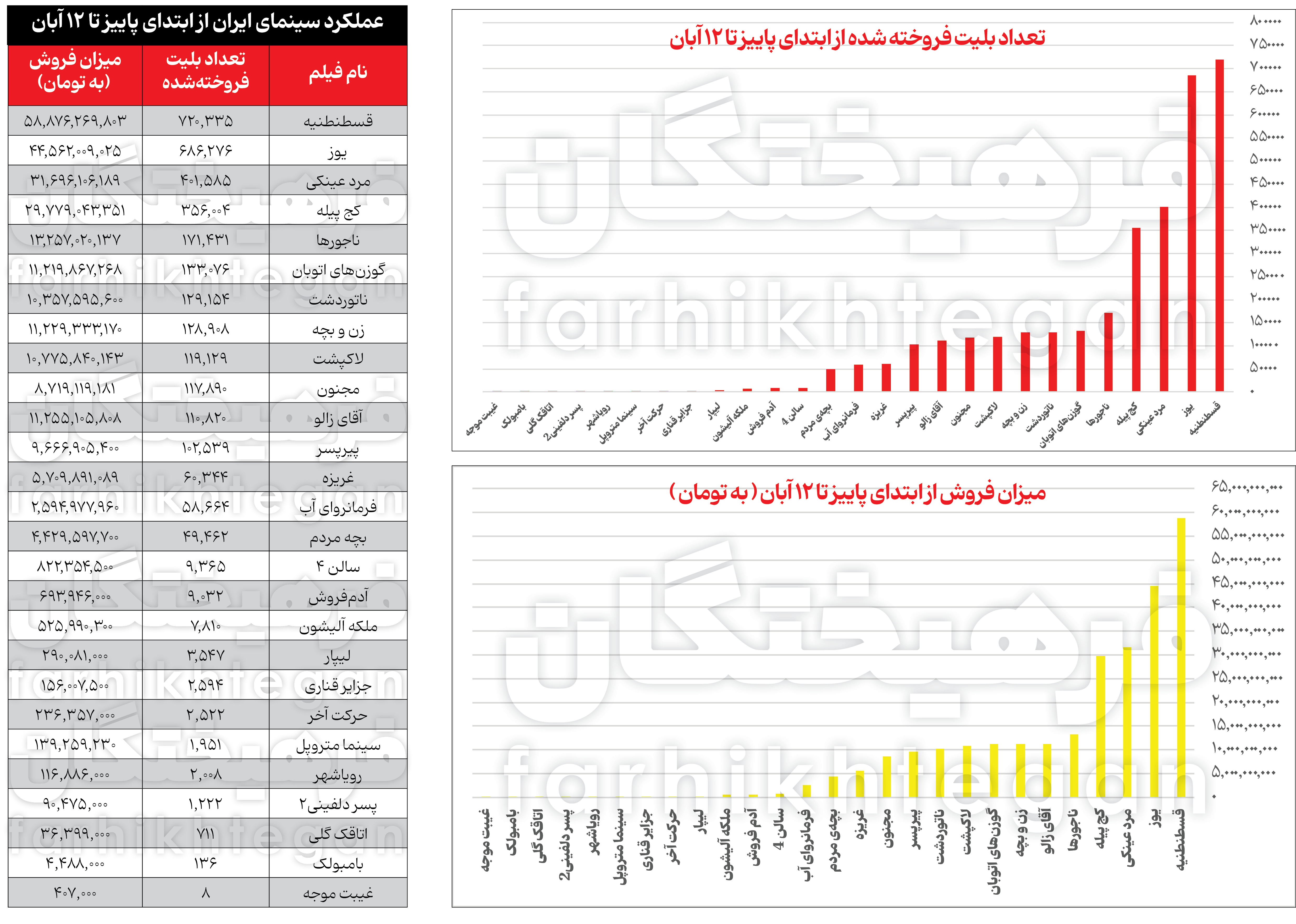 محمدحسین سلطانی، خبرنگار گروه فرهنگ: از ابتدای پاییز تا 24 ساعت قبل، کمی بیش از سهمیلیون و 700 هزار بلیت در سینماهای ایران به فروش رفته؛ رقمی که در قیاس با مدت مشابه در سال گذشته حدود یکمیلیون کاهش پیدا کرده است. همین چندماه قبل بود که چنین ادعا شد که سینمای اجتماعی ایران با «پیرپسر»، «زن و بچه»، «لاکپشت» و دیگر آثار در حال احیا شدن و بازگشت به روزهای خوش است؛ اما اعداد و ارقام نشان میدهد در چهارمین و آخرین ماه اکران طلایهدار سینمای اجتماعی یعنی فیلم پیرپسر، این فیلم نتوانست فراتر از 103 هزار بلیت فراتر برود و تولیداتی همچون زن و بچه و لاکپشت هم در روزهای آخر اکرانشان به یکچهارم فروش کمدیهای بالا جدول نمیرسند. ماجرای احیای سینمای اجتماعی تنها استدلالی نیست که در تابستان طرح شد و در پاییز رنگ باخت، موضوعاتی همچون پایان سلطه کمدیها بر گیشه، اقبال بیشتر مخاطبان به سینما در سال جاری و دیگر موضوعاتی از این دست باعث شده سینمای ملتهب ایران در چند ماه اخیر در ابهام جدیتری بیفتد، ابهامهایی که باعث شد سینمای ایران سؤالهای جدیتری را در ادامه پاییز و فصل سرما مقابل خود ببیند. سینمایی که حالا باز هم یک کمدی صدرنشین جدول اکرانش در پاییز است، آن هم با کمتر از یکمیلیون مخاطب.