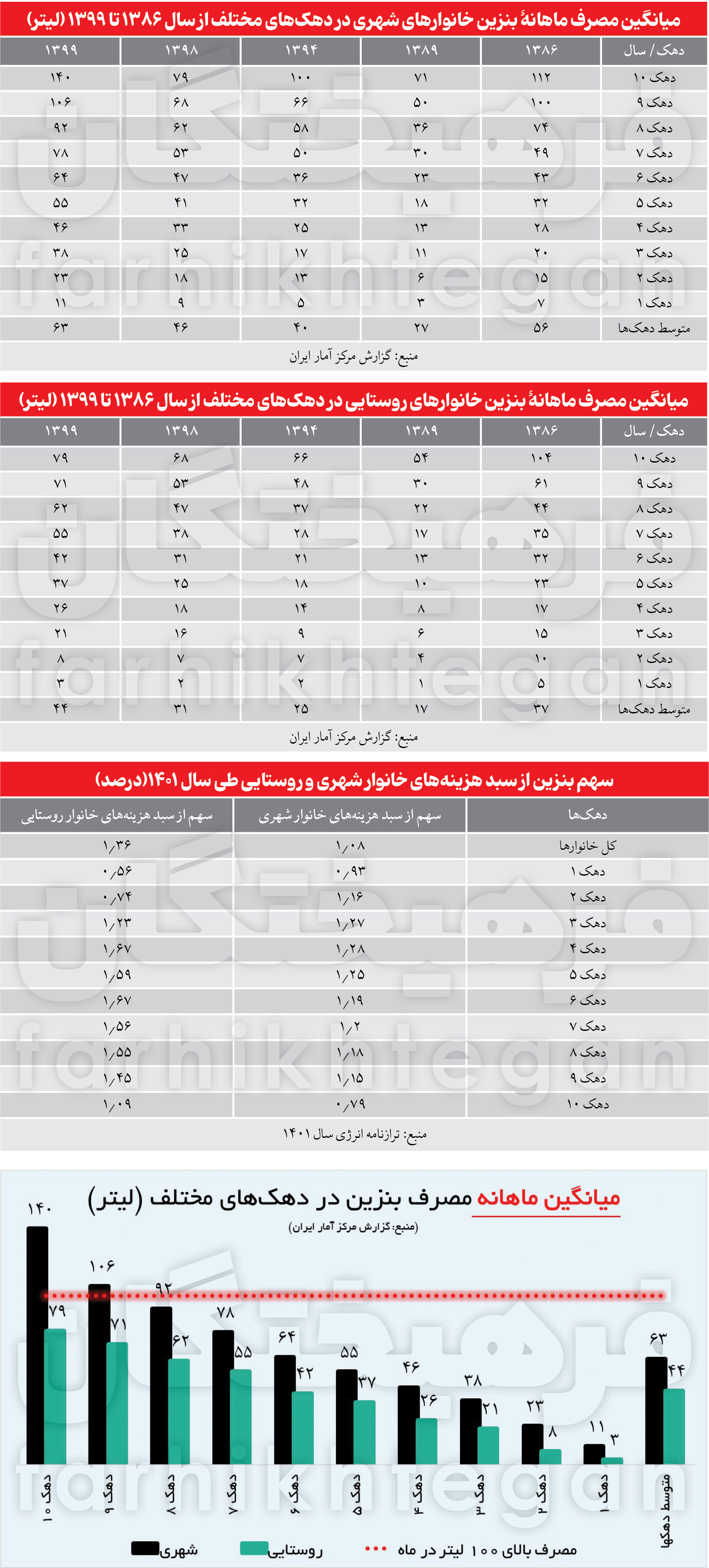 بر اساس گزارش مرکز آمار ایران، میانگین مصرف ماهانه بنزین خانوارهای شهری در سالهای ۱۳۸۶ تا ۱۳۹۹ روند افزایشی و متفاوتی در دهکهای درآمدی داشته است. میانگین مصرف خانوارهای شهری در کل دهکها از ۵۶ لیتر در سال ۱۳۸۶ به ۶۳ لیتر در سال ۱۳۹۹ رسید. با این حال، این رشد در دهکهای پردرآمد بسیار پررنگتر بوده است. دهک دهم، پردرآمدترین خانوارها، از مصرف ماهانه ۱۱۲ لیتر در سال ۱۳۸۶ به ۱۴۰ لیتر در سال ۱۳۹۹ رسیده است و بهرغم افت مصرف در برخی سالها مانند ۱۳۸۹ (۷۱ لیتر) به واسطه طرح هدفمندی یارانهها و ۱۳۹۸ (۷۹ لیتر) افزایش چشمگیر قیمت، در نهایت بالاترین میزان مصرف را ثبت کرده است.