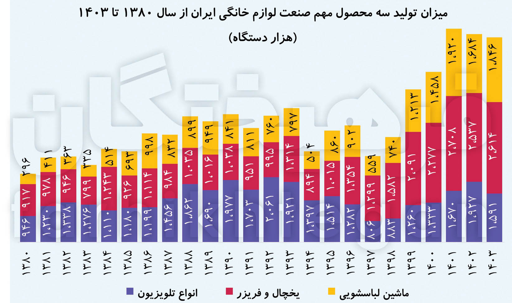 بررسی روند تولید لوازم خانگی طی دو دهه گذشته نشان میدهد که بازار ایران از سال ۱۳۸۰ تا ۱۴۰۳، تحولات چشمگیری را پشت سر گذاشته است. در این بازه، سه گروه اصلی لوازم خانگی یعنی ماشین لباسشویی، یخچال و فریزر و انواع تلویزیون افزایش قابلتوجهی را بهویژه پس از برقراری تحریمها علیه ایران در سال 96 تجربه کردهاند. در ابتدای دهه ۱۳۸۰، میزان تولید هر سه گروه کالایی یعنی ماشین لباسشویی، یخچال و فریزر و انواع تلویزیون روندی آرام و رو به رشد داشت. تولید تلویزیون از حدود ۹۴۶ هزار دستگاه در سال ۱۳۸۰ به بیش از یکمیلیون و 300 هزار دستگاه در سال ۱۳۸۲ رسید و تولید یخچال و فریزر نیز در همین سالها با افزایش تقاضا تا بیش از یکمیلیون و 200 هزار دستگاه رشد کرد. تولید ماشین لباسشویی نیز از کمتر از ۳۰۰ هزار دستگاه در سال 80 به حدود 363 هزار دستگاه در سال 82 رسید. این دوره را میتوان دوران ثبات نسبی تولید و بازار و رشد دانست؛ زمانی که واردات برندهای خارجی نیز جریان داشت و تولید داخلی در رقابت با آنها قرار میگرفت.
