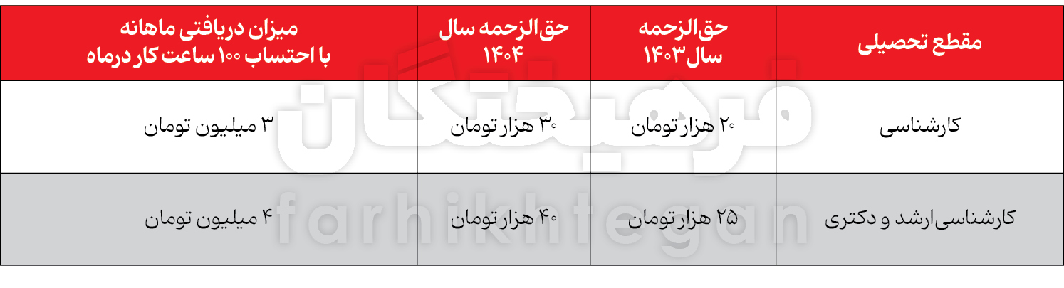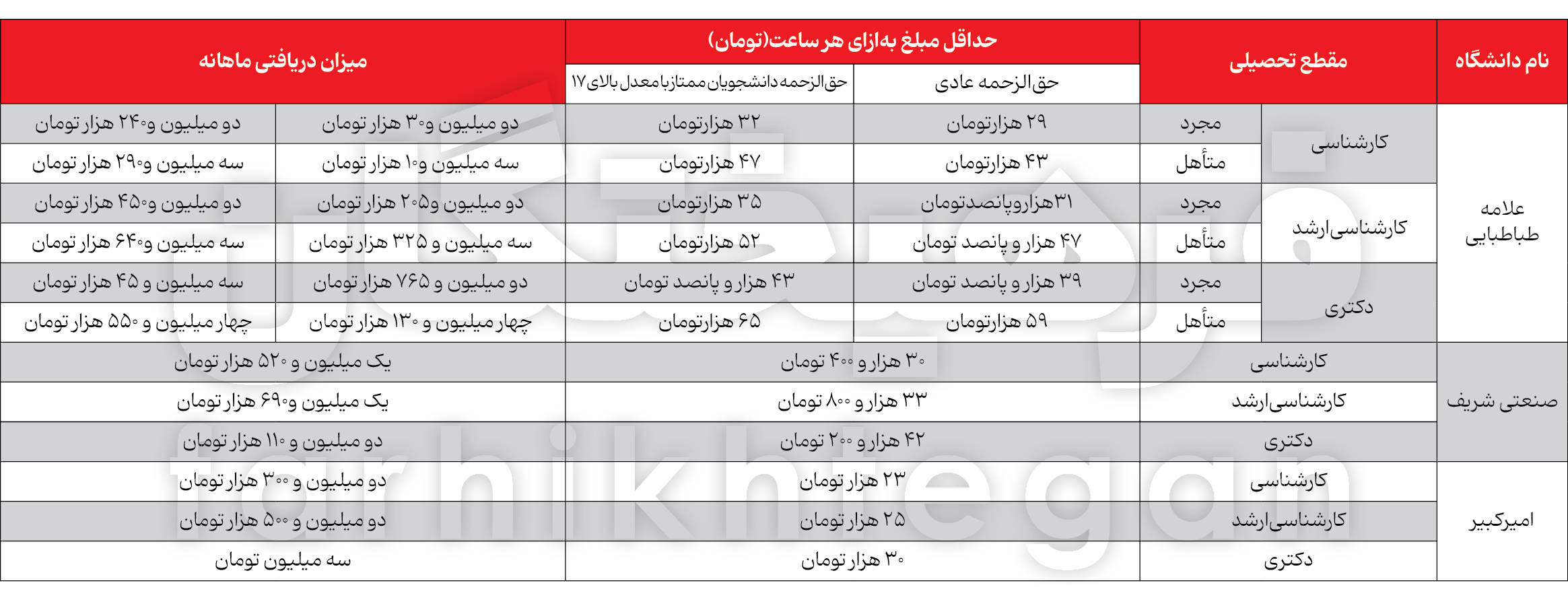 دانشگاه صنعتی شریف نیز با اعمال افزایش ۳۰ درصدی در پرداختها، حقالزحمه دانشجویان را با احتساب سقف ۵۰ ساعت در ماه برای دانشجویان کارشناسی ۳۰ هزار و ۴۰۰ تومان، کارشناسیارشد ۳۳ هزار و ۸۰۰ تومان و دکتری ۴۲ هزار و ۲۰۰ تومان بهازای هر ساعت تعیین کرده است و دانشگاه صنعتی امیرکبیر نیز با درنظرگرفتن افزایش ۲۰ درصدی در نرخها و سقف ۱۰۰ ساعت کار دانشجویی در ماه، ۲۳ هزار تومان برای کارشناسی، ۲۵ هزار تومان برای کارشناسیارشد و ۳۰ هزار تومان برای دکتری پرداخت میکند.