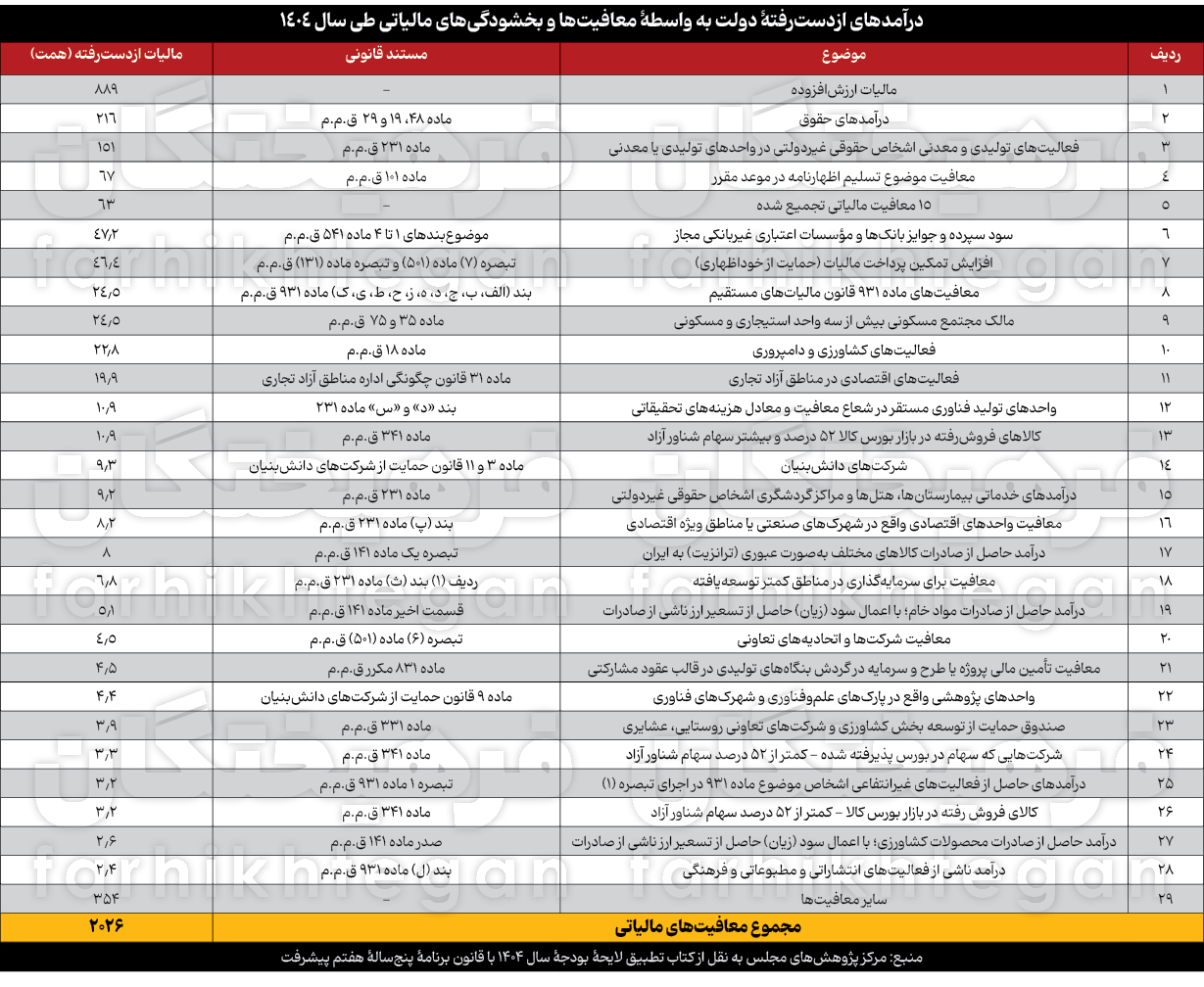 مطابق بند (ب) ماده (27) قانون برنامه هفتم، وزارت امور اقتصادی و دارایی مکلف است بهمنظور شفافیت حمایتهای مالیاتی، بهصورت سالانه فهرست تمامی تخفیفات، اعتبار مالیاتی، نرخ صفر، معافیت یا بخشودگی و ترجیحات مالیاتی و گمرکی را تهیه و میزان درآمد از دسترفته دولت ناشی از موارد مذکور را با توجه به استنادات قانونی مربوط به تفکیک محاسبه کند. سازمان برنامهوبودجه نیز مکلف به انتشار آن در قالب پیوست بودجه سنواتی است. در متن ماده واحده و جداول کلان لایحه بودجه 1404 به مجلس، این فهرست وجود ندارد، ولی در کتاب «تطبیق لایحه بودجه سال1404 با قانون برنامه پنجساله هفتم پیشرفت» که همراه با بودجه به مجلس ارسال شده، فهرست درآمدهای ازدسترفته دولت در پیوست آن قابلمشاهده است. طبق گزارش مرکز پژوهشهای مجلس که با عنوان «بررسی بخش دوم لایحه بودجه سال 1404: درآمدهای مالیاتی» منتشر شده نشان میدهد برای سال 1404، برآورد مجموع درآمد از دست رفته دولت ناشی از انواع معافیتها، بخشودگیها و تخفیفات مالیاتی 2026 هزار میلیارد تومان است. این در حالی است که در لایحه بودجه 1404، میزان پیشبینیشده برای کل درآمدهای مالیاتی 2084 هزار میلیارد تومان است (بدوناحتساب مالیات بر واردات این درآمدها،۱۸۲۰ همت است). به عبارت دیگر، دولت تقریباً معادل مالیاتی که دریافت میکند، معافیت مالیاتی اعطا کرده است. بررسیهای مرکز پژوهشهای مجلس مبتنی بر اظهارنامههای اشخاص حقوقی نشان میدهد این وضعیت در سالهای قبل نیز تقریباً به همین روال بوده و میزان درآمد از دست رفته دولت بیش از درآمدهای مالیاتی بوده است. بر اساس آمارهای ارائه شده از سوی سازمان برنامهوبودجه در کتاب «تطبیق لایحه بودجه سال1404 با قانون برنامه پنجساله هفتم»، بزرگترین رقم مربوط به معافیتهای مالیاتی، 889 هزار میلیارد تومان درآمد ازدسترفته ناشی از معافیتهای مالیات بر ارزش افزوده است. پس از آن رقم 354 هزار میلیارد تومان ناشی از سایر معافیتها، 216 هزار میلیارد تومان ناشی از معافیتهای حقوق و دستمزد و 151 هزار میلیارد تومان ناشی از معافیت فعالیتهای تولیدی و معدنی ماده 132 قانون مالیاتهای مستقیم است. 67 همت معافیت موضوع تسلیم اظهارنامه در موعد مقرر، 47 همت مالیات بر سود سپردهها، 46 همت معافیت افزایش تمکین پرداخت مالیات (حمایت از خوداظهاری)، 24.5 همت معافیتهای ماده 931 قانون مالیاتهای مستقیم، 24.5 همت معافیت مالیاتی مالک مجتمع مسکونی بیش از سه واحد استیجاری و مسکونی، 22.8 همت معافیت مالیاتی فعالیتهای کشاورزی و حدود 20 همت مربوط به فعالیتهای اقتصادی در مناطق آزاد تجاری است. سایر بخشها نیز بین 2 تا 11 همت معافیت مالیاتی دارند که در جدول گزارش حاضر لیست آنها آمده و بخشی از آنها نیز در قالب 15 مورد معافیت مالیاتی با رقم 63 همت تجمیع شده است. همچنین بزرگبودن رقم «سایر معافیتها» نشان از عدم دقت کافی در محاسبه و ثبت جزئیات معافیتها دارد.