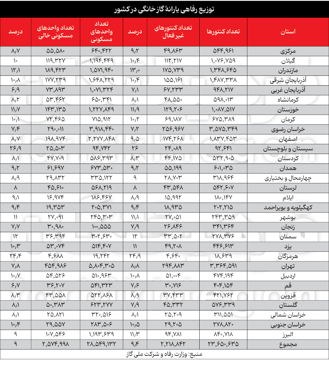 تازهترین آمارها از توزیع یارانه گاز خانگی در کشور نشان میدهد میزان واحدهای مسکونی خالی و تعداد کنتورهای فعال در استانها تفاوتهای قابلتوجهی دارد. بر اساس دادهها، استان سیستان و بلوچستان با 26.9 درصد واحدهای مسکونی خالی و نزدیک به 26 درصد کنتورهای خالی، بالاترین نرخ خالی بودن واحدها را در بین استانها دارد. پس از آن، استان هرمزگان با 24.4 درصد واحد مسکونی خالی و 24.9 درصد کنتور خالی قرار دارد. از سوی دیگر، استانهای قم و آذربایجان غربی با کمترین درصد واحدهای مسکونی خالی، به ترتیب 6.7 و 6.9 درصد، پایینترین نرخ خالی بودن واحدها را به خود اختصاص دادهاند. این استانها نشان میدهند که بخش عمدهای از واحدهای مسکونی، به صورت فعال مصرفکننده گاز هستند. در میان استانهای پرجمعیت، تهران با بیش از 5.8 میلیون واحد مسکونی و حدود 3 میلیون و 360 هزار کنتور فعال، بزرگترین شبکه مصرفکننده گاز خانگی کشور را دارد و 7.8 درصد واحدهای آن خالی اعلام شده است.