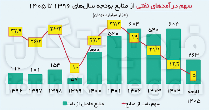 یکی از مهمترین اتفاقات در لایحه بودجه سال آینده، کاهش شدید اتکای بودجه به درآمدهای نفتی است، بهطوریکه براساس لایحه بودجه، در سال آینده رقم واگذاری داراییهای سرمایهای 275 همت خواهد بود که از این رقم 263 همت مربوط به منابع حاصل از نفت و فرآوردههای نفتی، 11.6 همت مربوط به منابع حاصل از مولدسازی داراییهای دولت و 120 میلیارد تومان نیز مربوط به منابع حاصل از واگذاری طرح تملک داراییهای سرمایهای است. نگاهی به درآمدهای نفتی نشان میدهد رقم 263 هزار میلیارد تومانی پیشبینی شده برای سال آینده به لحاظ ریالی کمترین مقدار درآمدهای نفتی پیشبینی شده از سال 1399 تاکنون بوده و همچنین نسبت به رقم 604 همت سال 1404 کاهش بیش از 56 درصدی داشته است. اما به لحاظ سهم از منابع بودجه عمومی نیز در سال آینده سهم نفت از بودجه عمومی فقط 5 درصد است که نسبت به رقم 12.2 درصدی سال جاری و 21 درصدی سال 1403 و 29 درصدی سال 1402 و 37 درصدی سال 1401 کاهش آن بسیار چشمگیر بوده و سهم نفت از بودجه عمومی در سال آینده کمترین مقدار در طول تاریخ نفت ایران، حداقل پس از پیروزی انقلاب اسلامی خواهد بود.