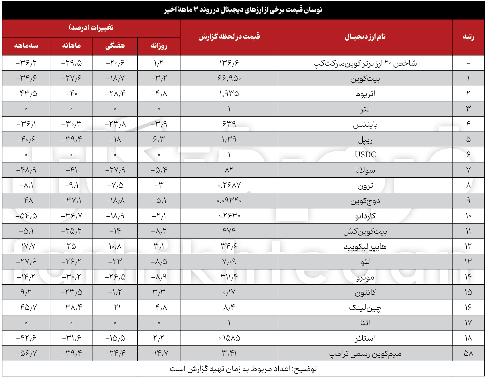 در بین 20 ارز برتر، طی سه ماه اخیر بیشترین افت مربوط به ارزهای اتریوم، سولانا، دوج کوین، کاردانو، چینلینک و استلار با بیش از 40 درصد بوده است. همچنین طی این مدت یکی از سنگینترین ریزشها را میم کوین رسمی ترامپ با حدود 57 درصد سقوط تجربه کرده است.